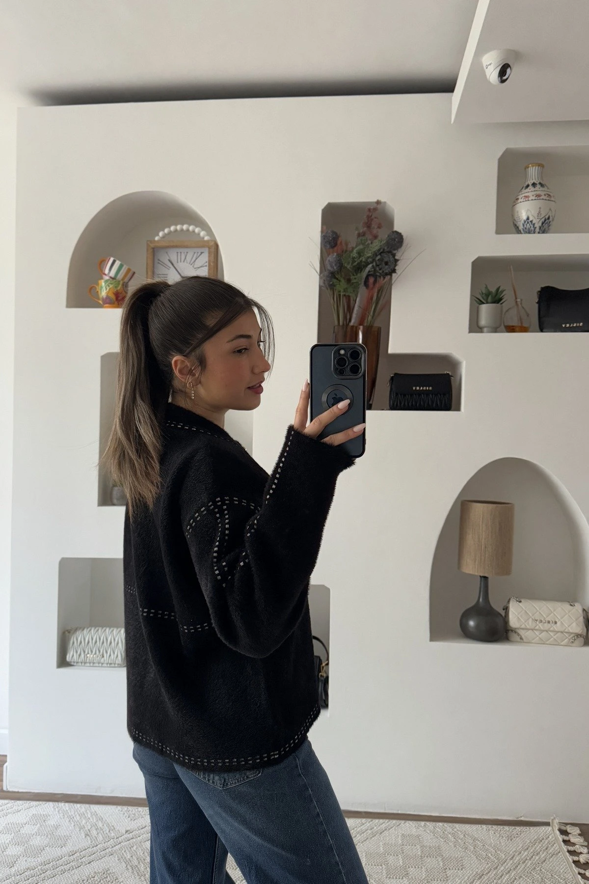 BİSİKLET YAKA ŞERİT DETAY GOLD DÜĞME YUMOŞ HIRKA – SİYAH BEYAZ