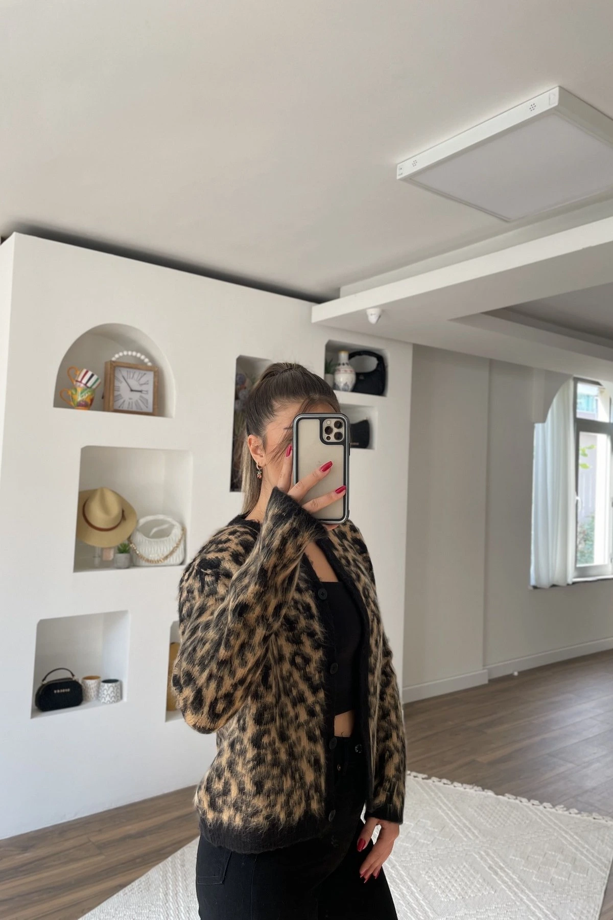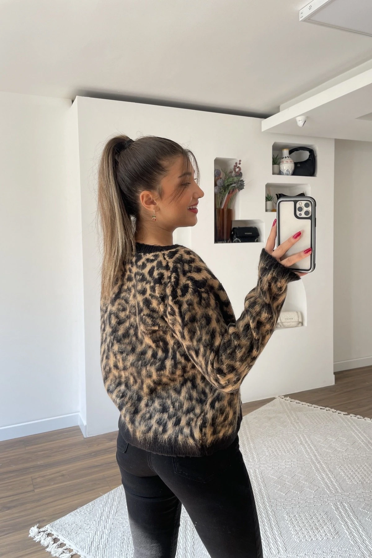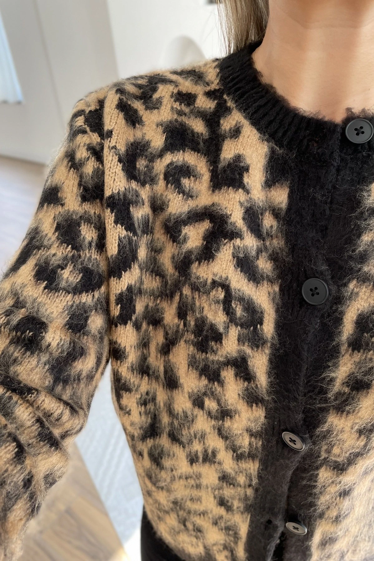 BİSİKLET YAKA VİSKON LEOPAR HIRKA – SİYAH CAMEL