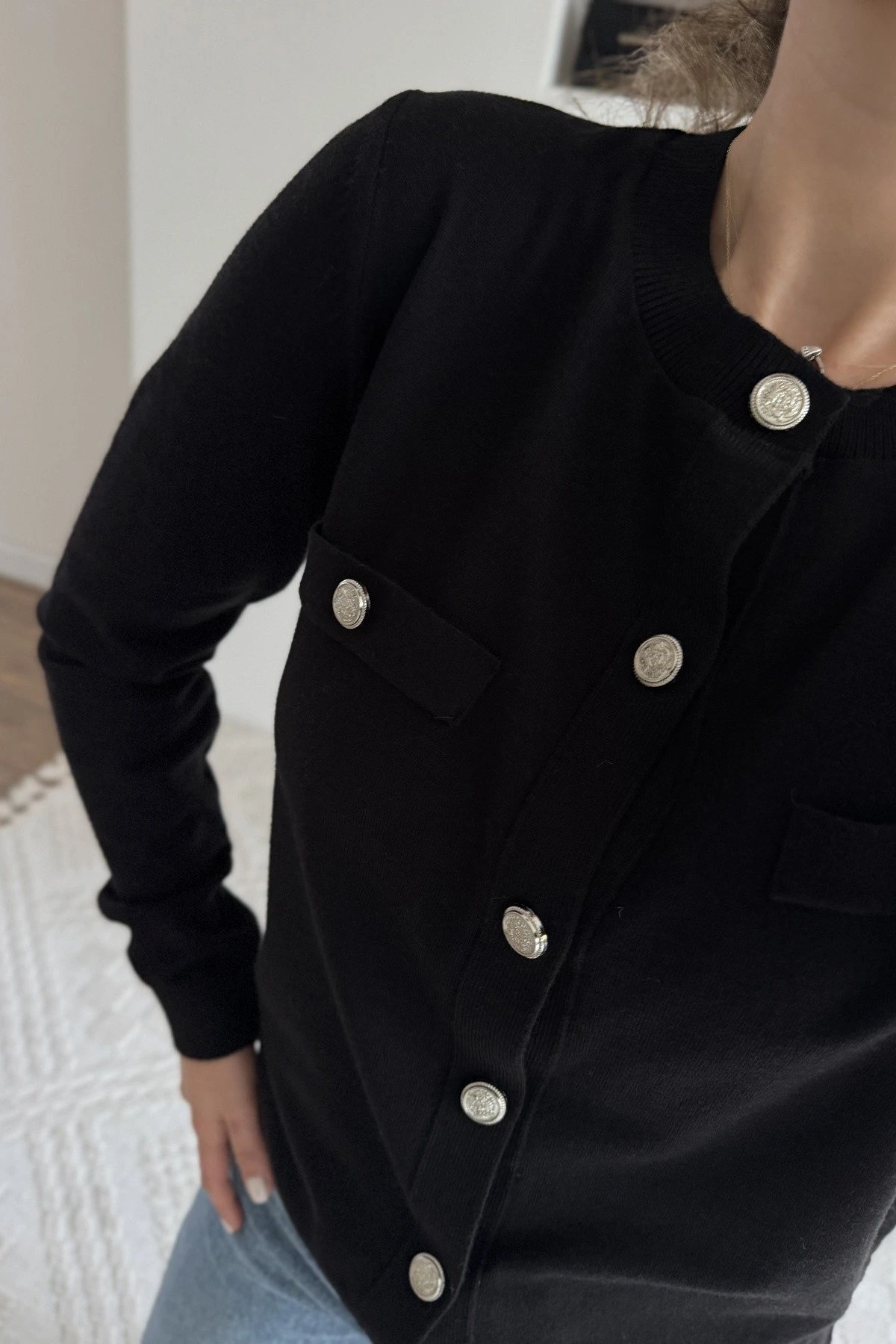 CEP GÖRÜNÜMLÜ SİLVER DÜĞMELİ UZUN KOL VİSKON HIRKA – SİYAH