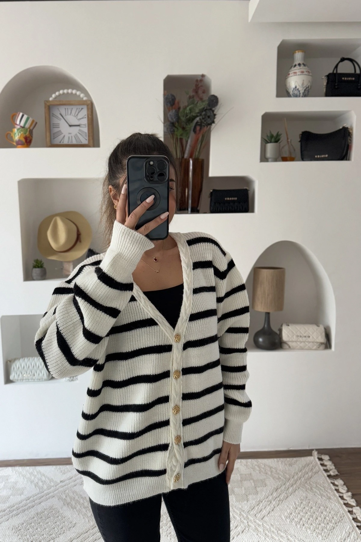 ÇİÇEK GOLD DÜĞME ŞERİT BURGU ÖRGÜ ÇİZGİLİ SALAŞ HIRKA – EKRU SİYAH