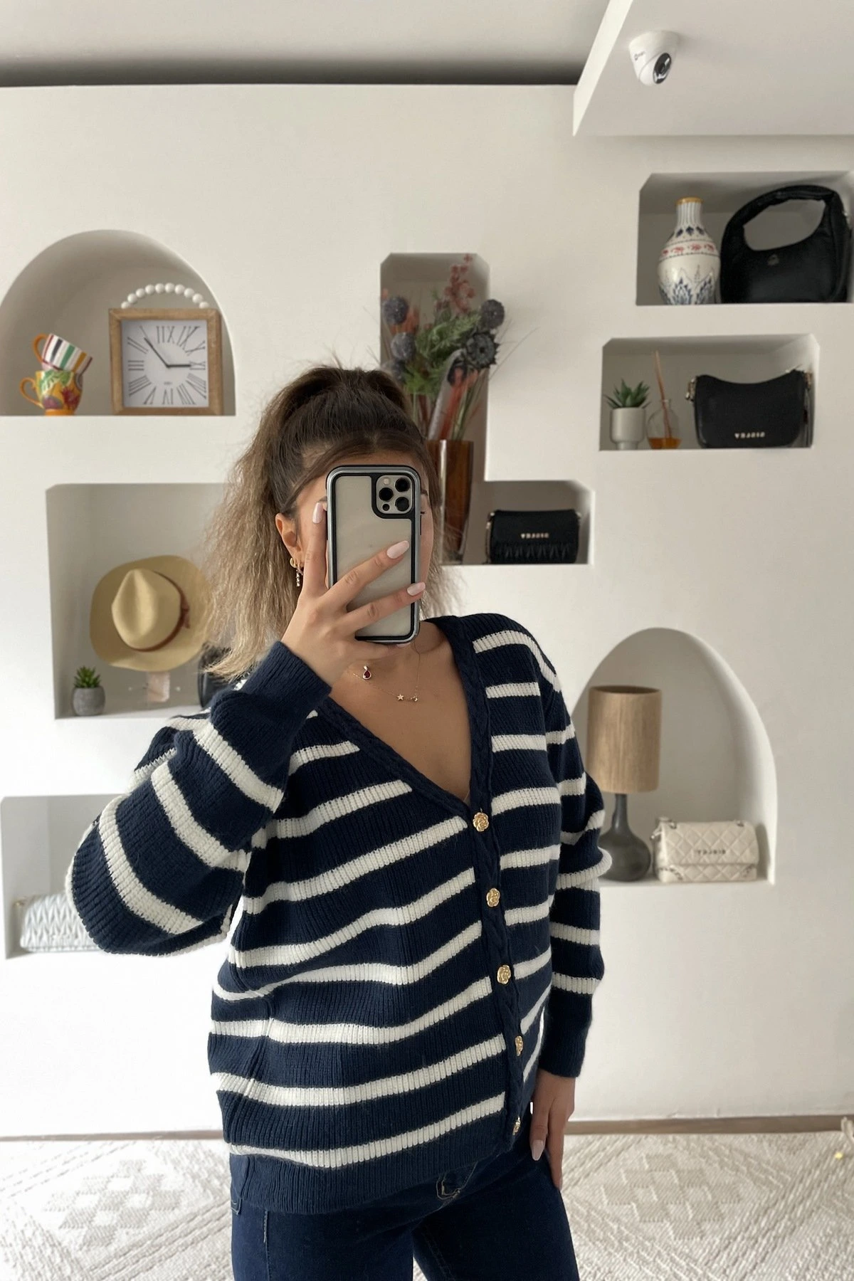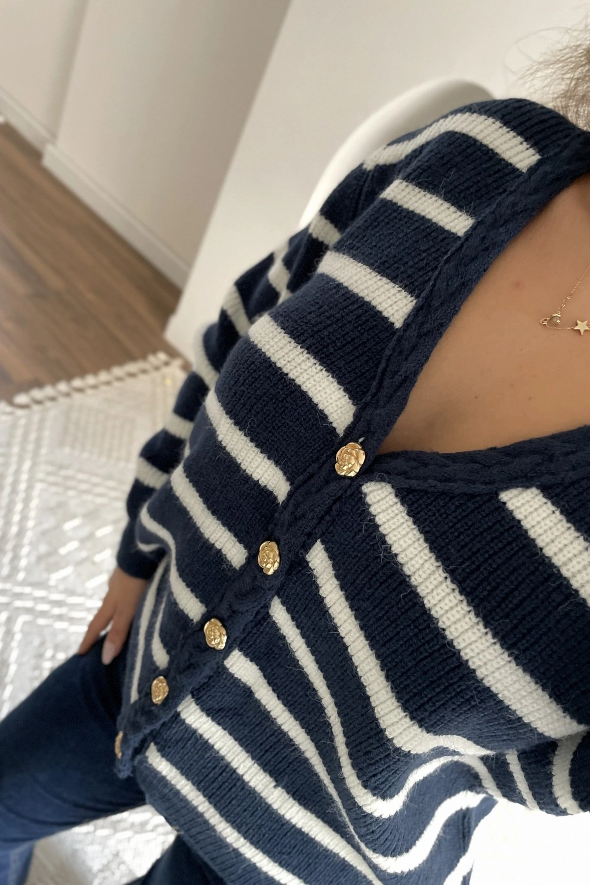 ÇİÇEK GOLD DÜĞME ŞERİT BURGU ÖRGÜ ÇİZGİLİ SALAŞ HIRKA – LACİVERT EKRU