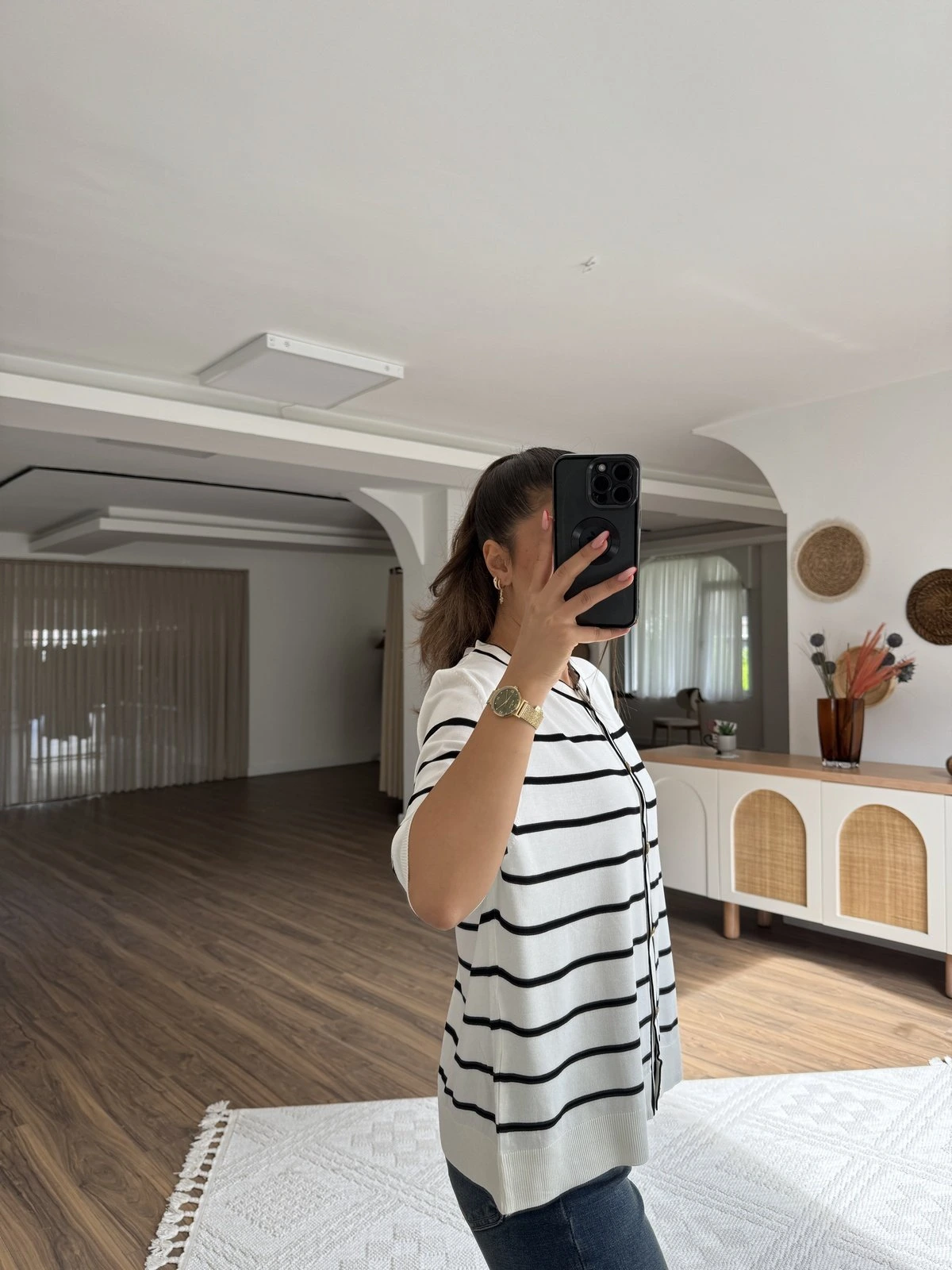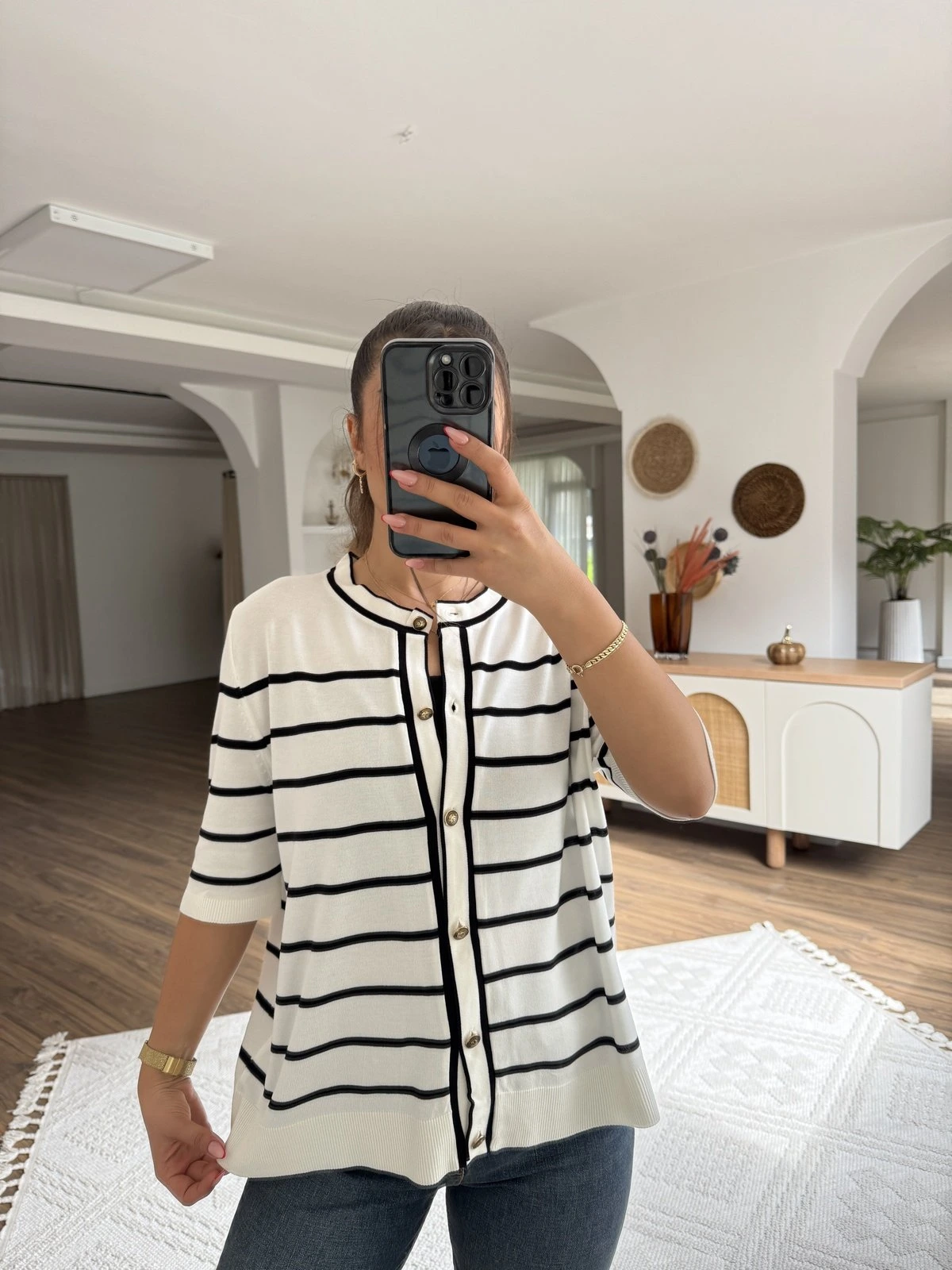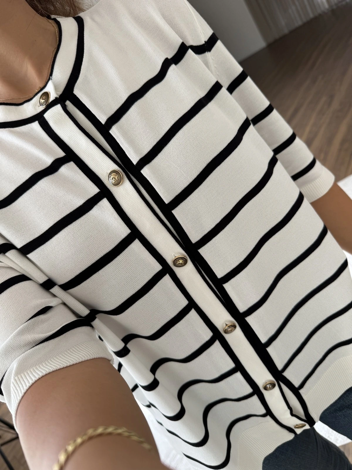 ÇİZGİLİ KISA KOL GOLD DÜĞME VİSKON HIRKA – EKRU SİYAH
