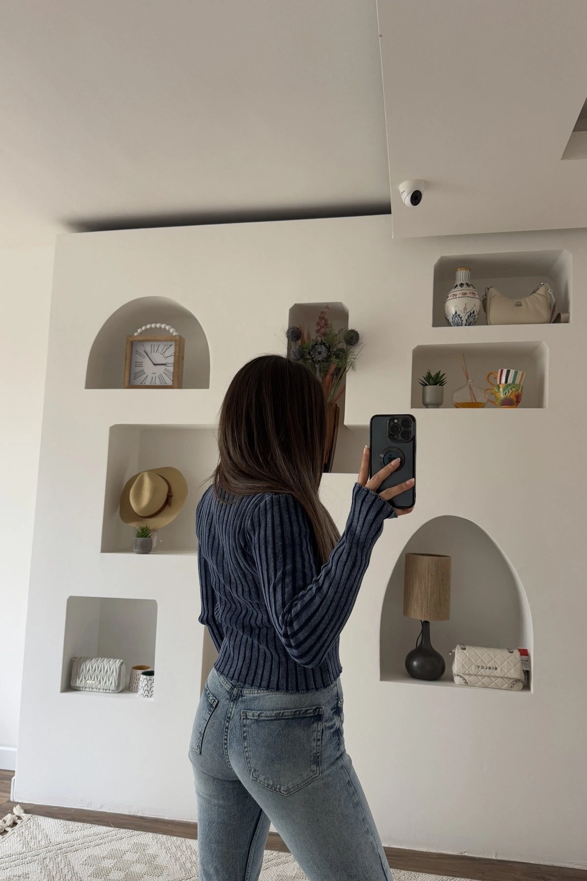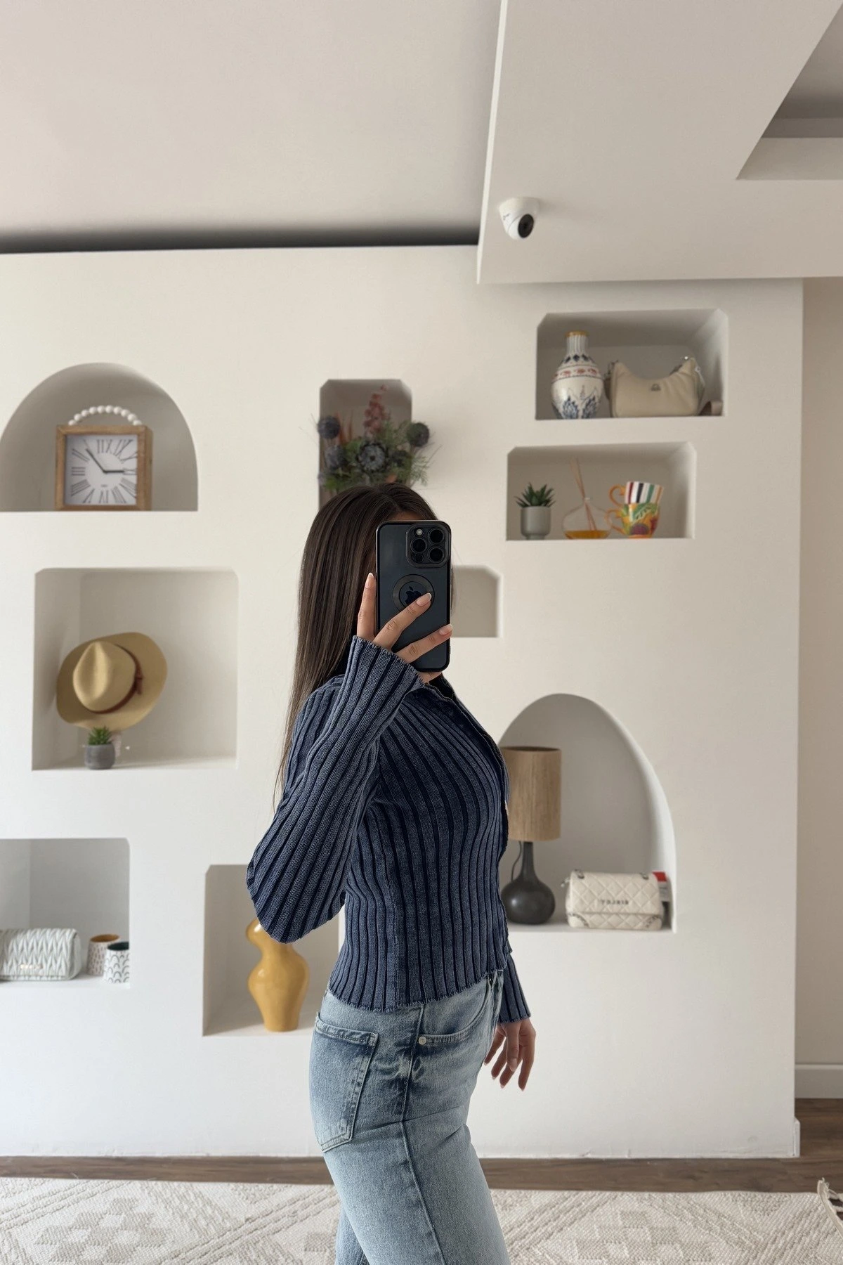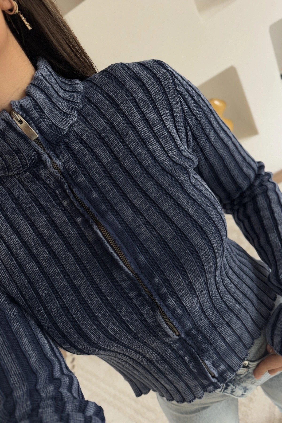 DİK YAKA SOLUK EFEKT FERMUARLI FİTİLLİ PAMUK HIRKA – İNDİGO