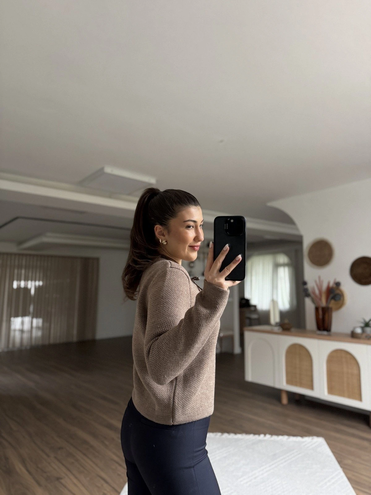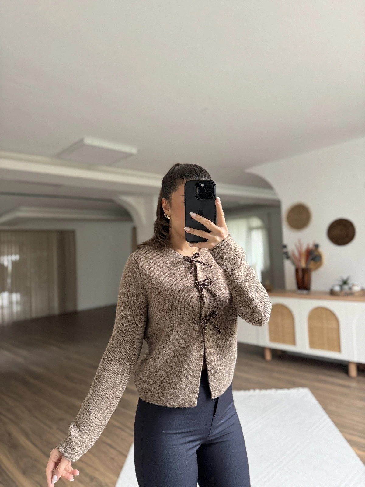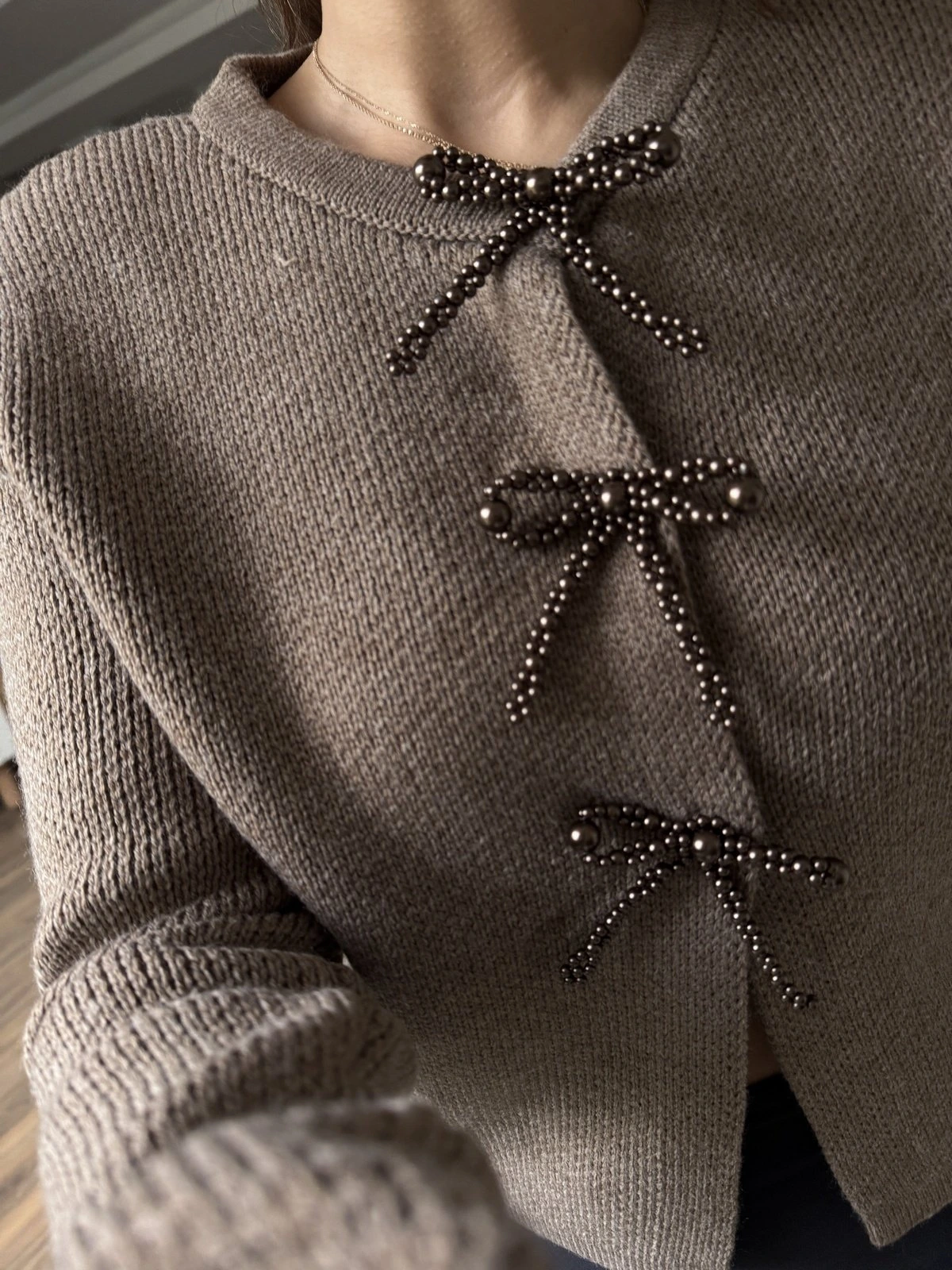 İNCİLİ FİYONK AKSESUARLI YÜN KARIŞIM HIRKA – VİZON