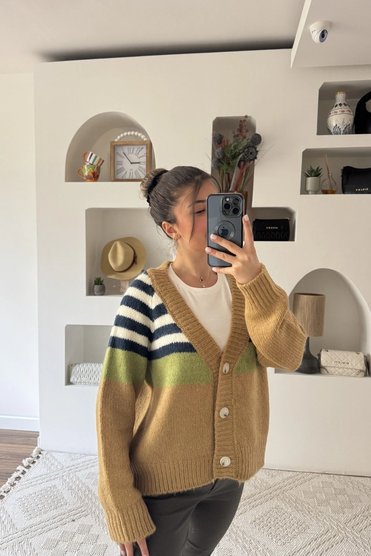 KEMİK 3 DÜĞME V YAKA RENKLİ ÇİZGİLİ VİSKKON HIRKA – CAMEL
