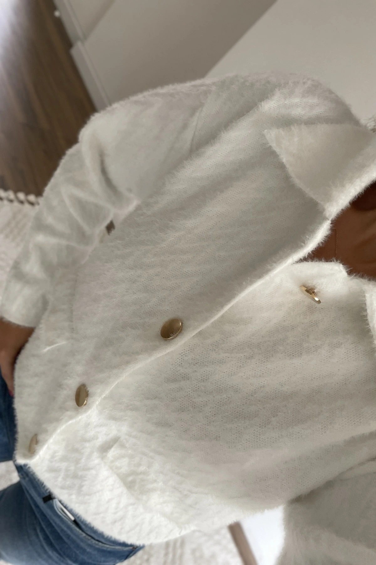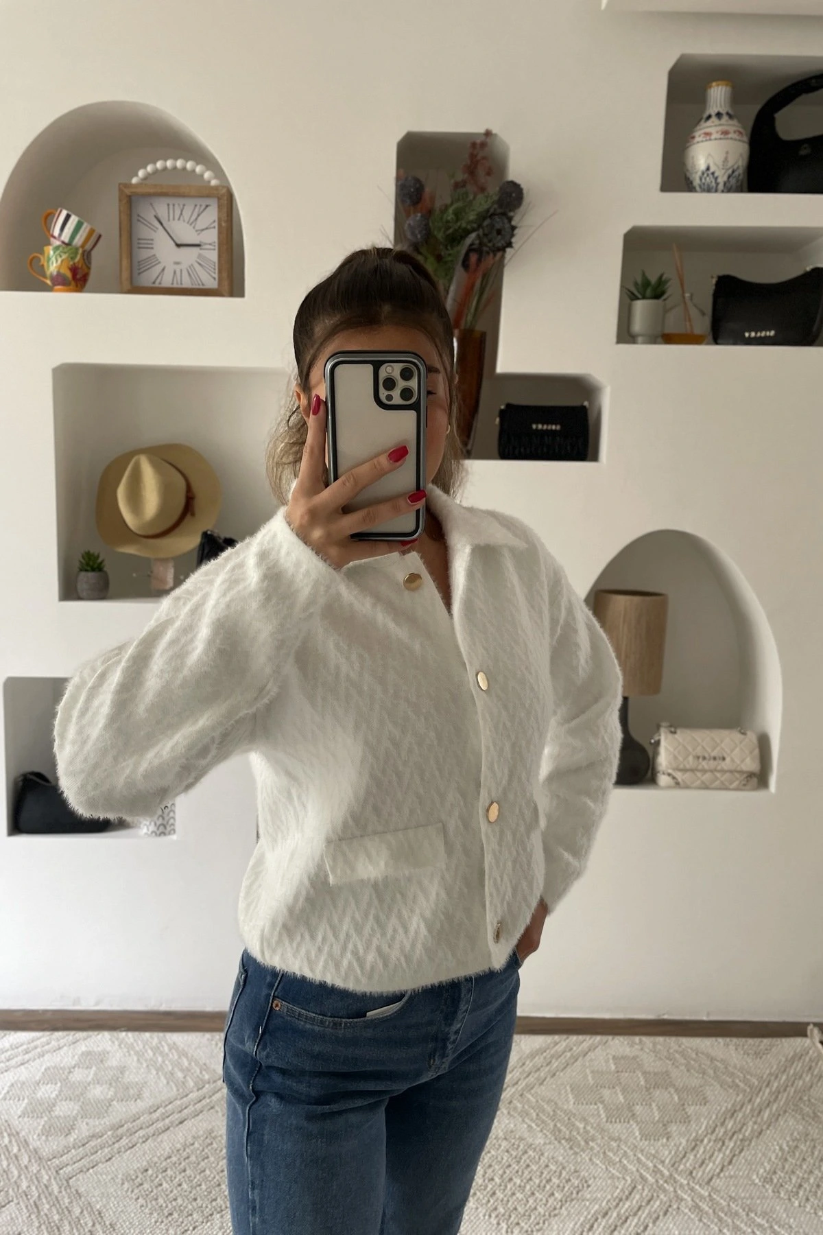 KENDİNDEN DOKULU YUMOŞ DÜĞMELİ CEP GÖRÜNÜM YAKALI HIRKA – EKRU