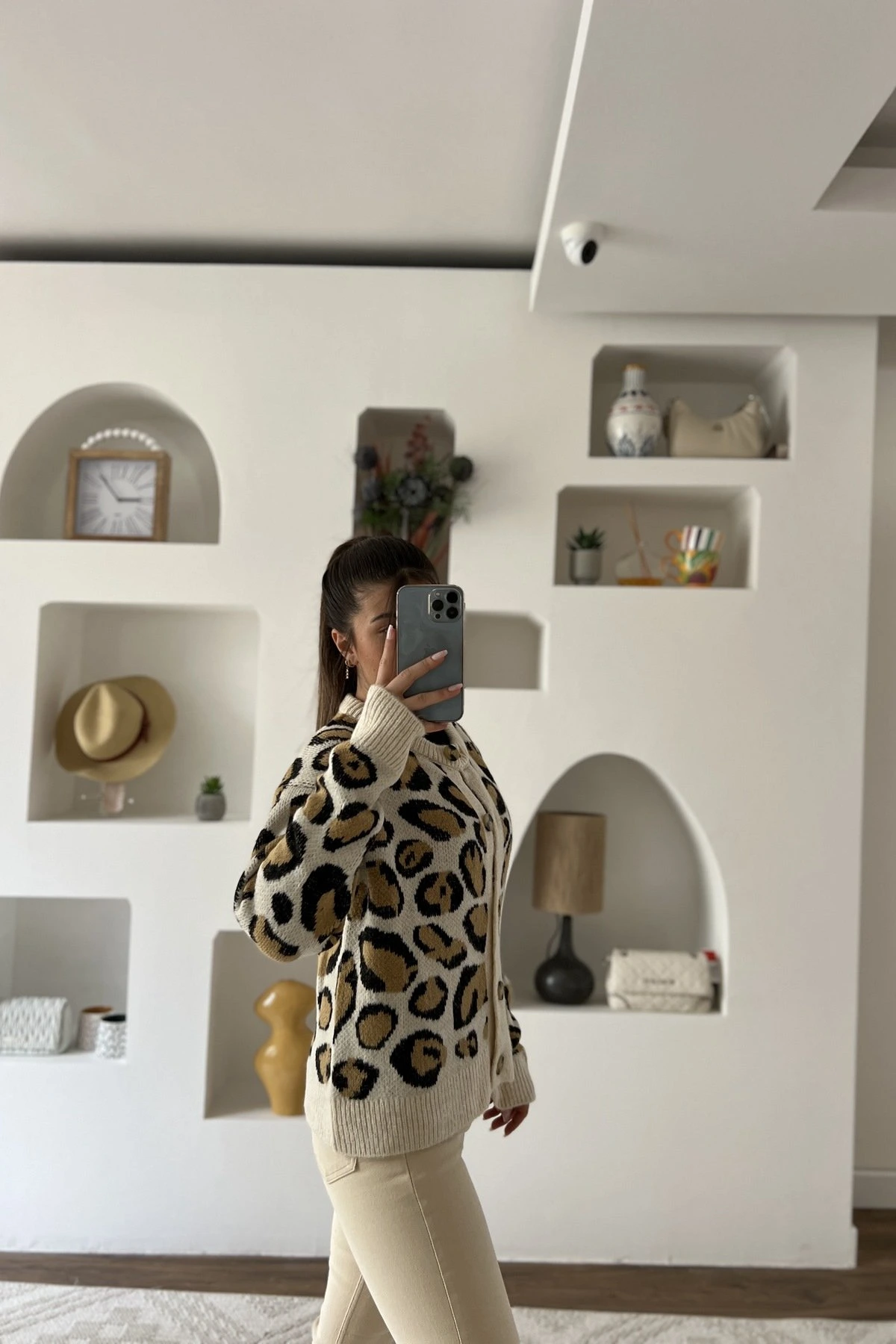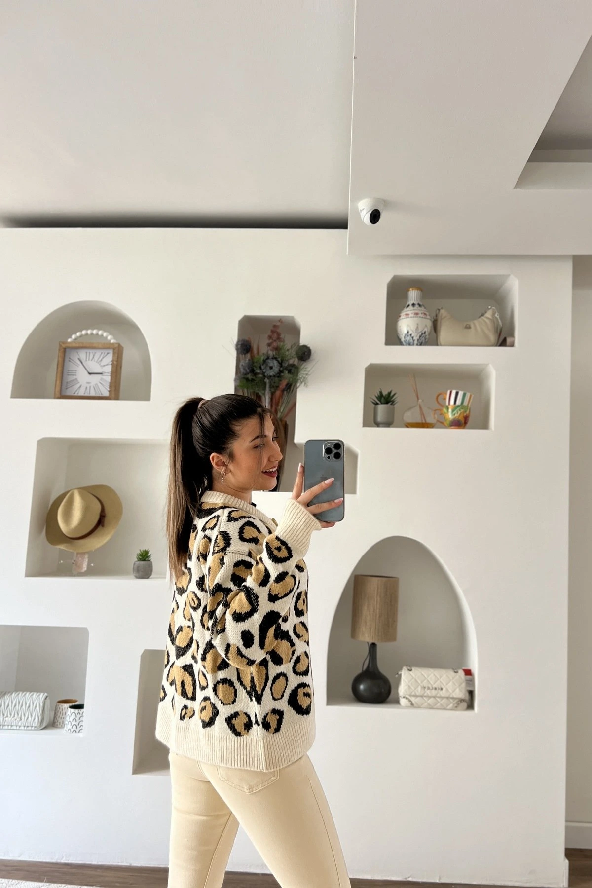 LEOPAR DESEN BİSİKLET YAKA KEMİK DÜĞME VİSKON HIRKA – TAŞ