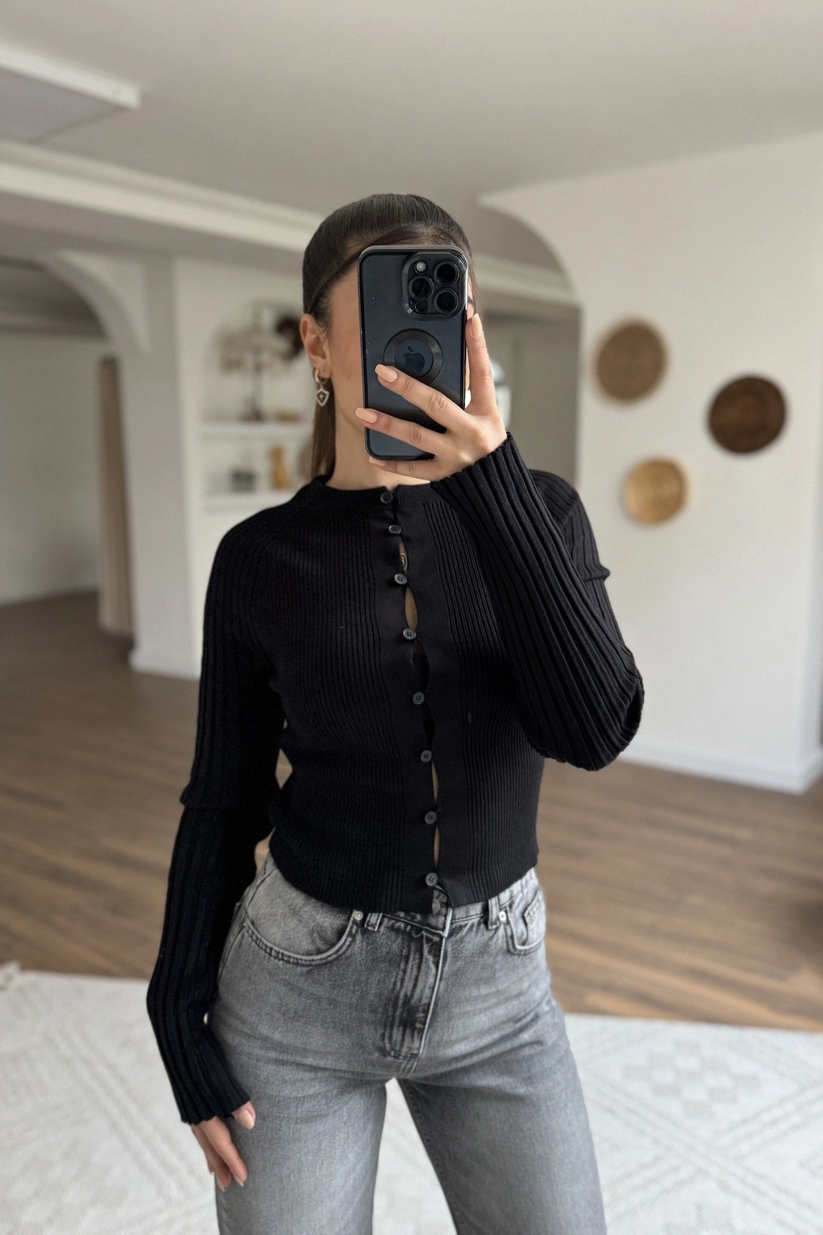 AÇIK DÜĞME DETAY VİSKON İNCE FİTİLLİ HIRKA – SİYAH