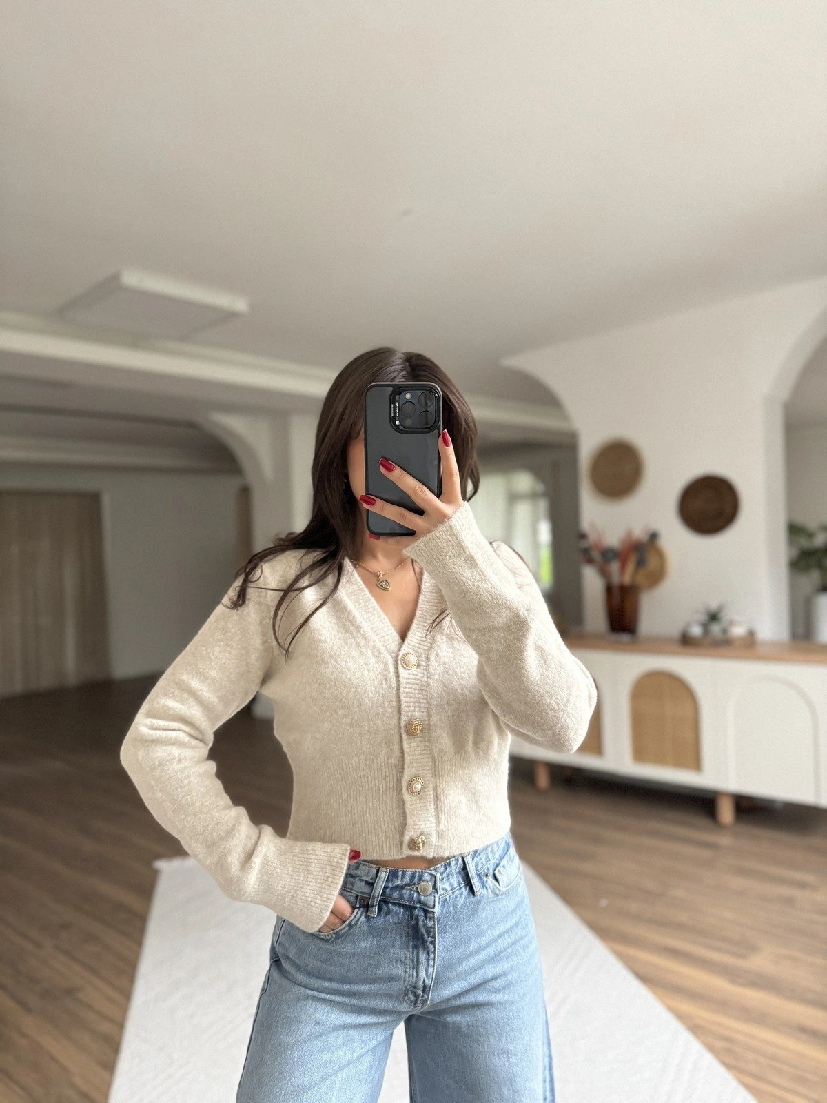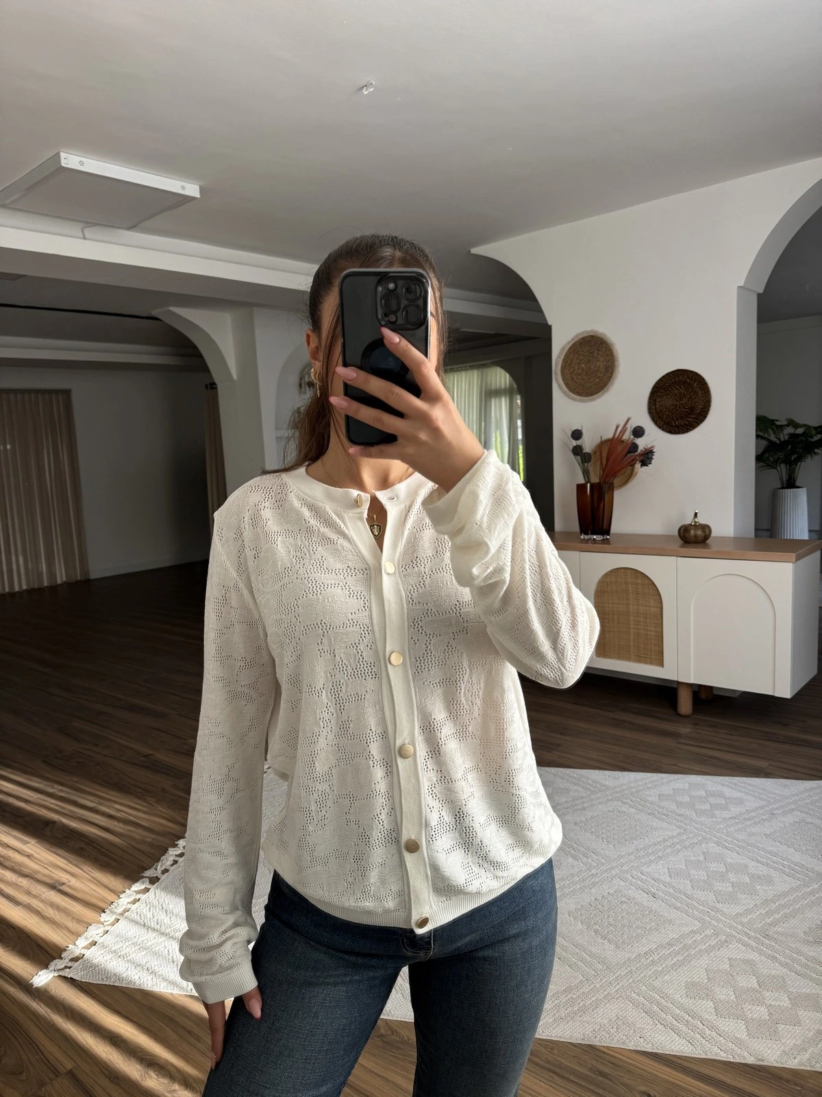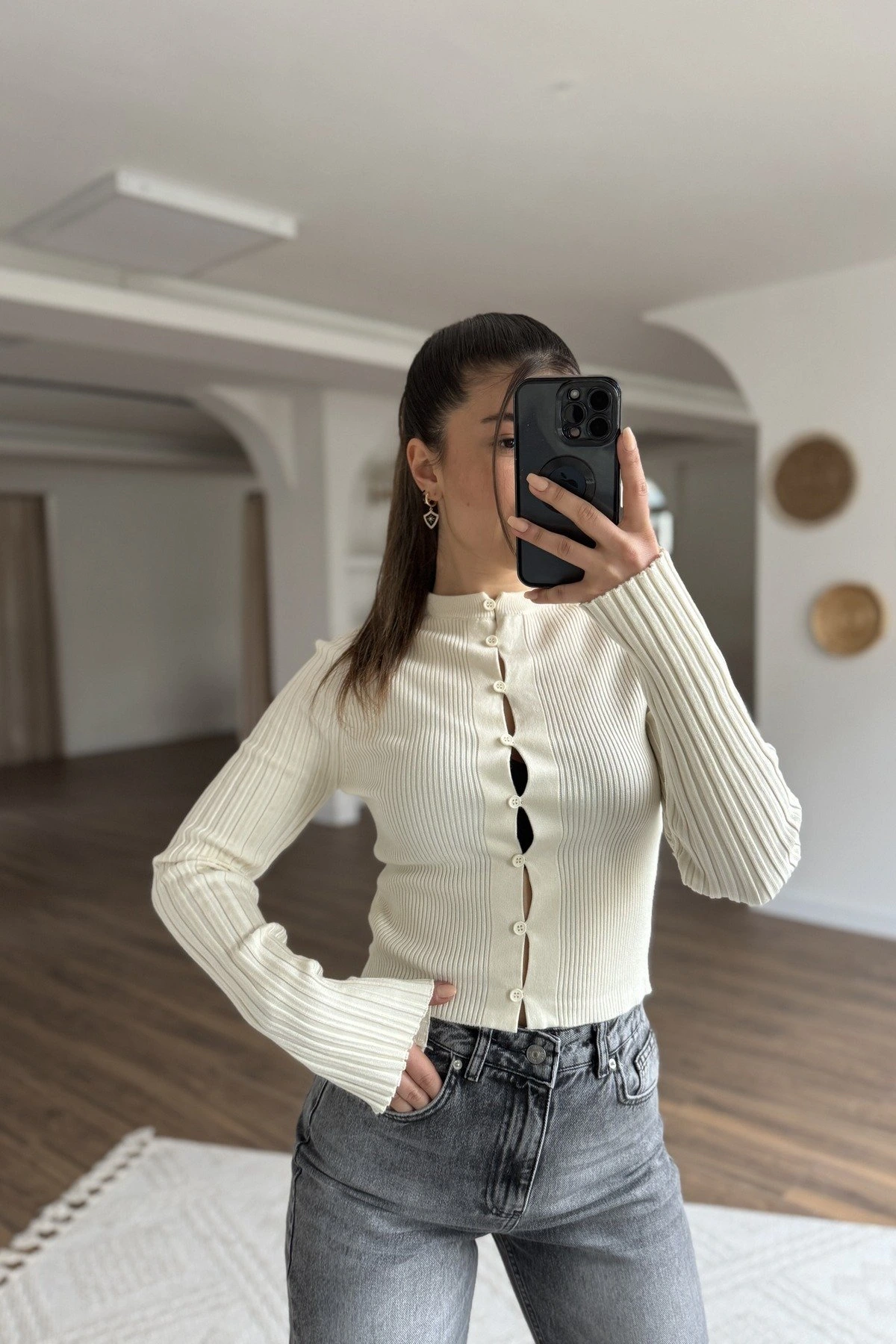 AÇIK DÜĞME DETAY VİSKON İNCE FİTİLLİ HIRKA – KREM