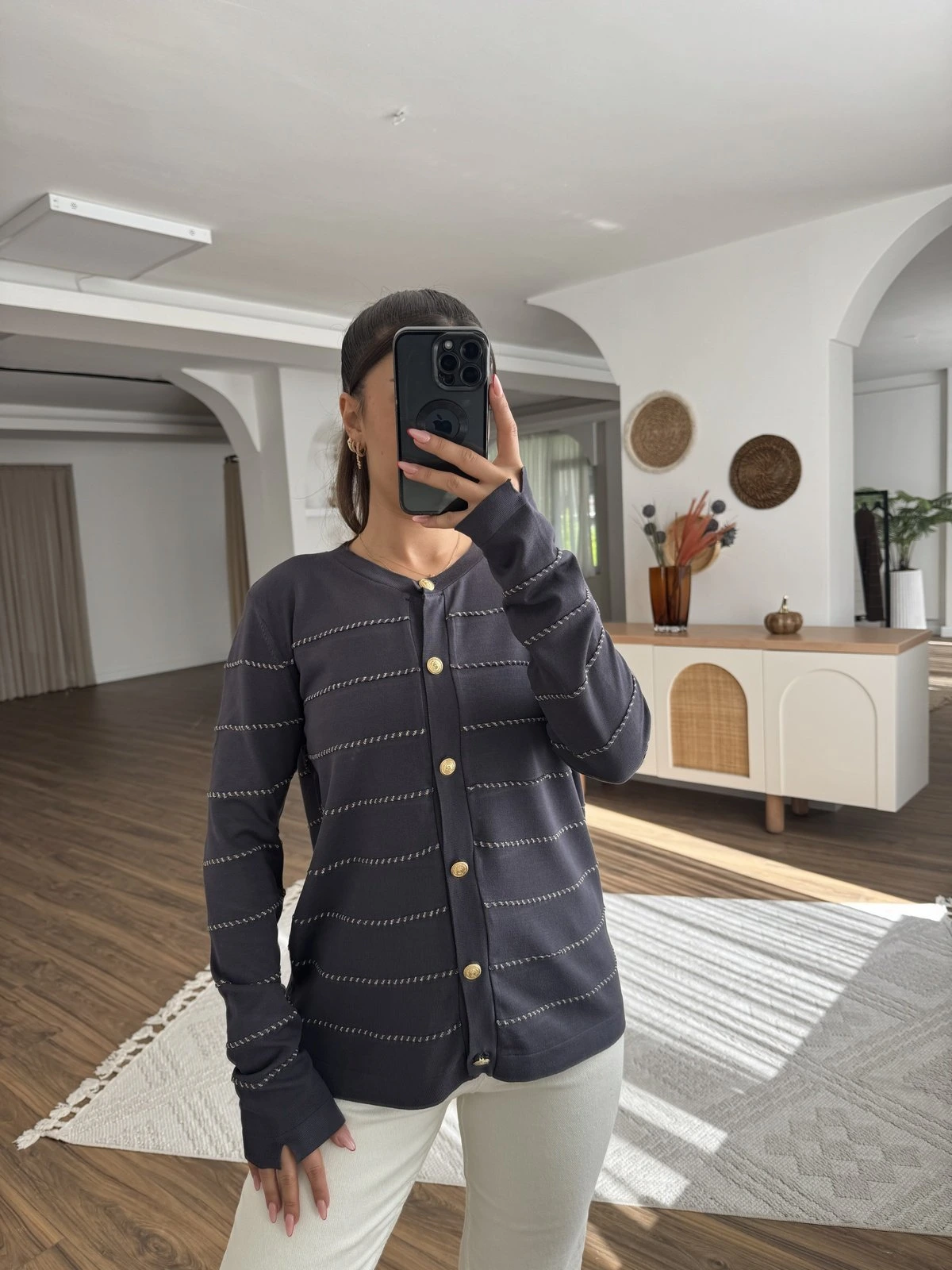 ÇİÇEK GOLD DÜĞME ŞERİT BURGU ÖRGÜ ÇİZGİLİ SALAŞ HIRKA – EKRU SİYAH