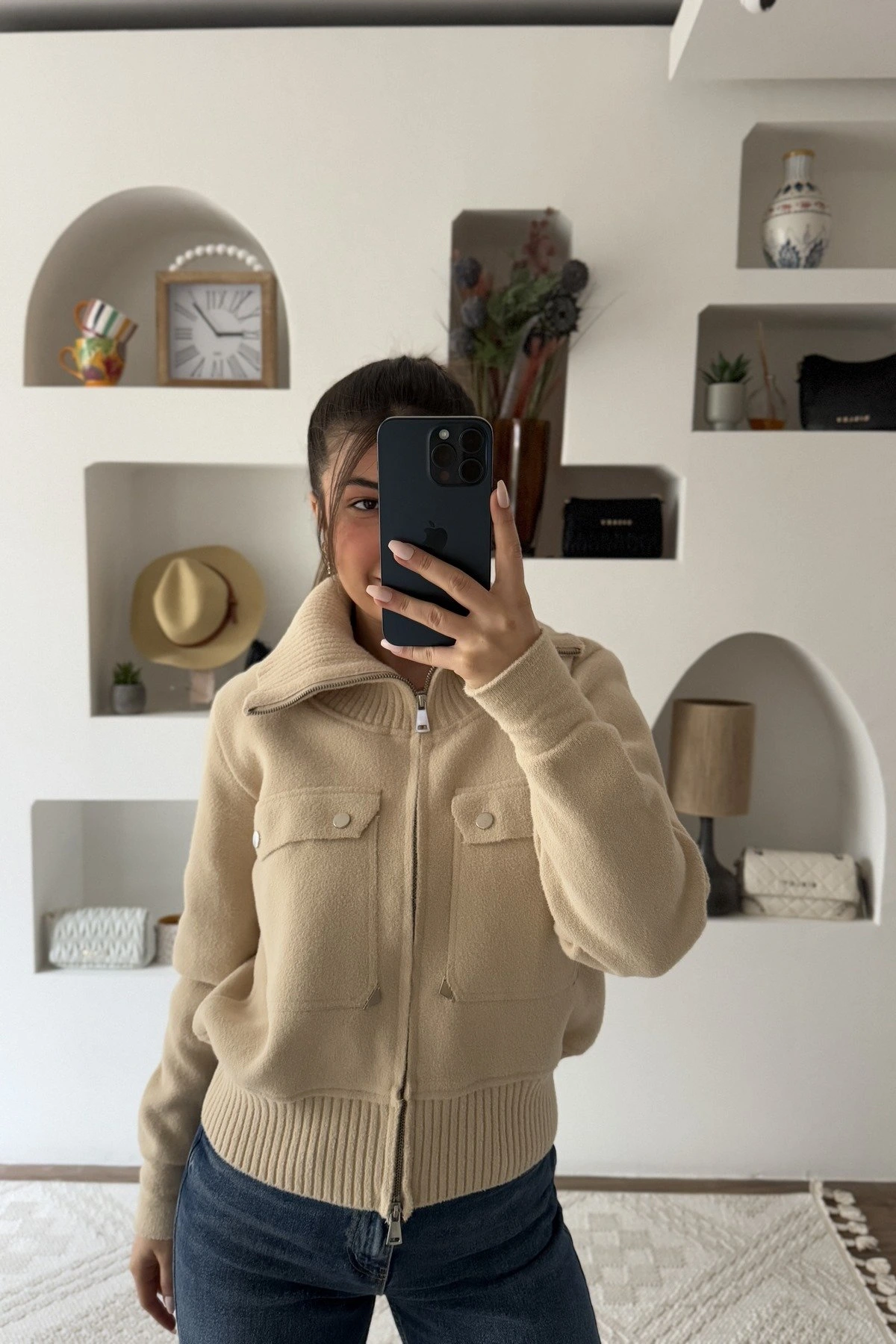 DİK YAKA BİYE DETAY CEPLİ FERMUARLI YUMUŞAK DOKU HIRKA – CAMEL