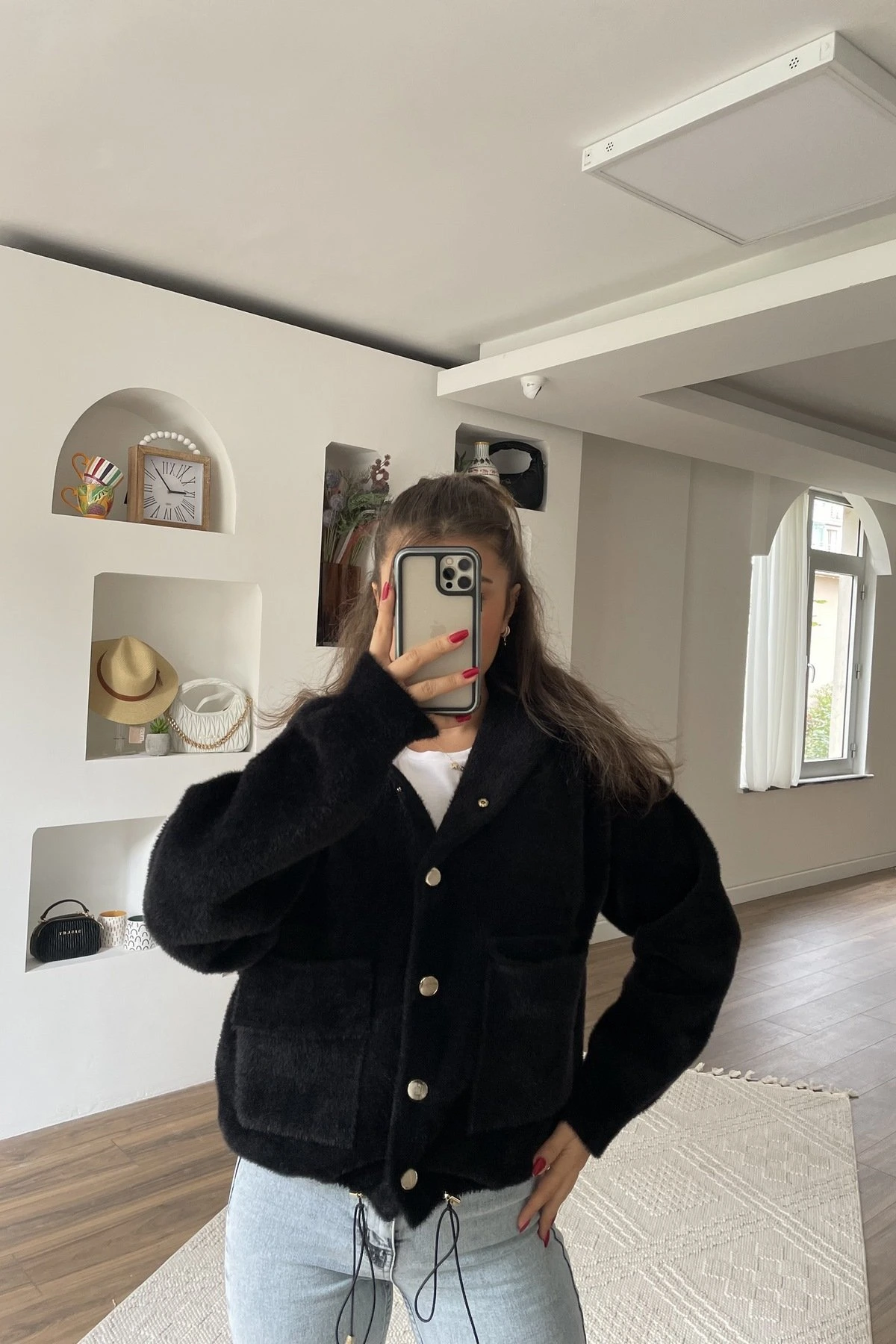 SIFIR YAKA CEPLİ DÜĞME DETAYLI YUMUŞAK DOKU CEKET MODEL HIRKA – SİYAH