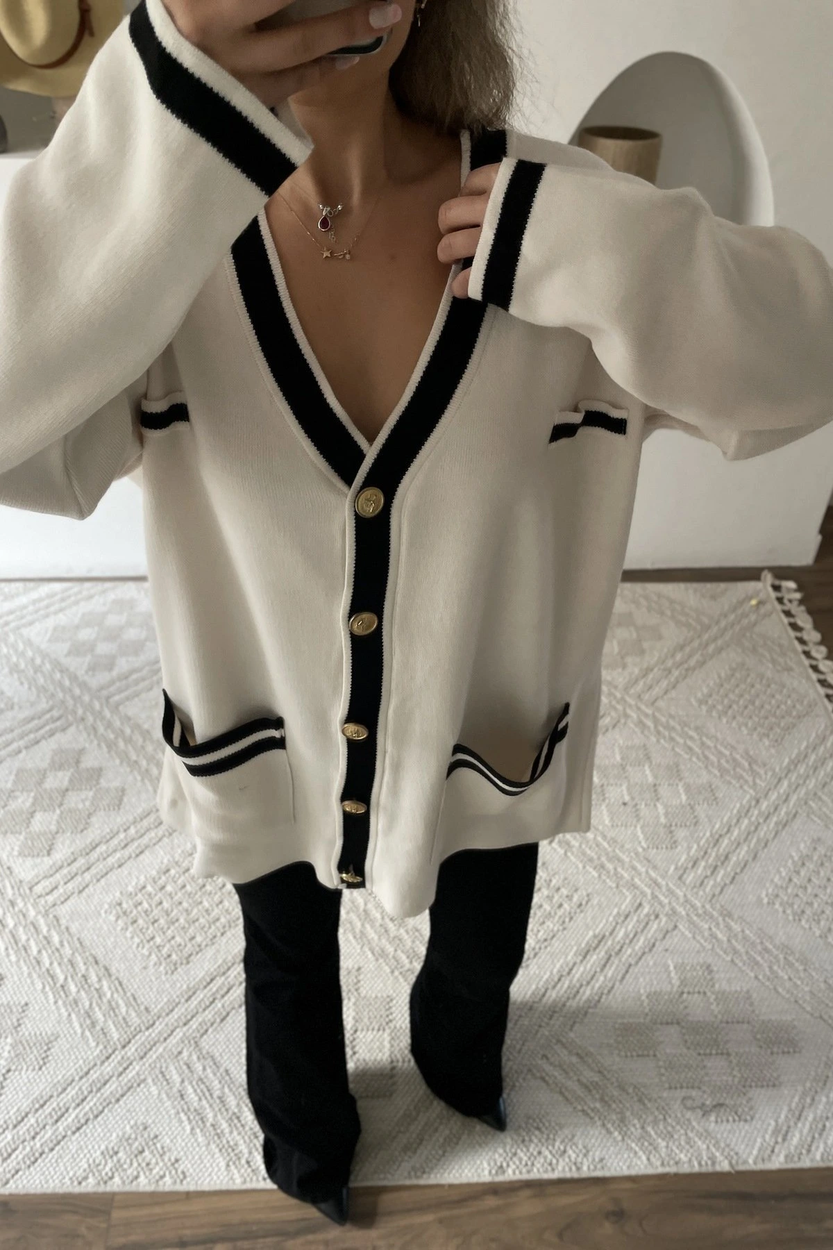 ÇİZGİLİ YUMOŞ GOLD DÜĞME CEP GÖRÜNÜM HIRKA – EKRU SİYAH