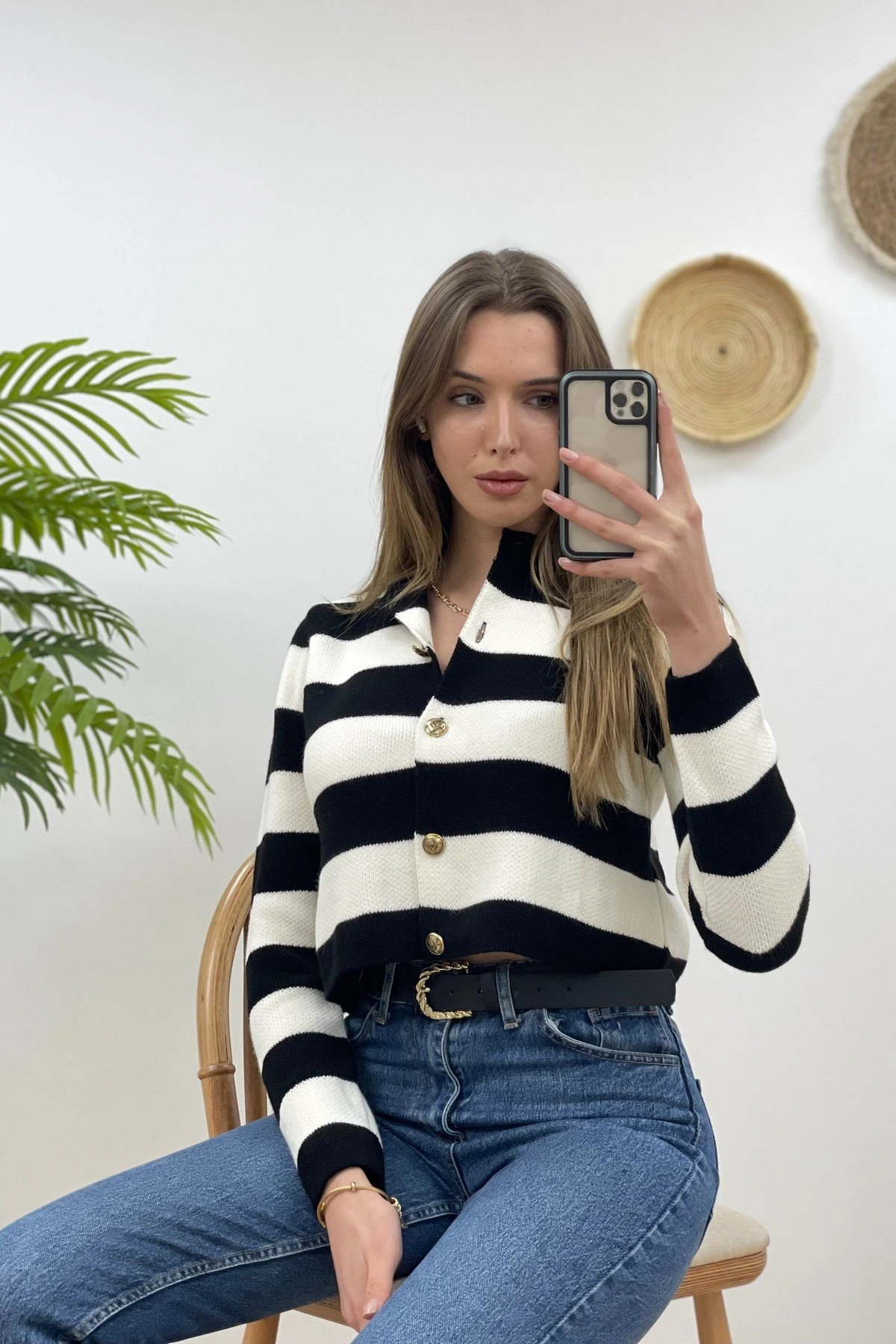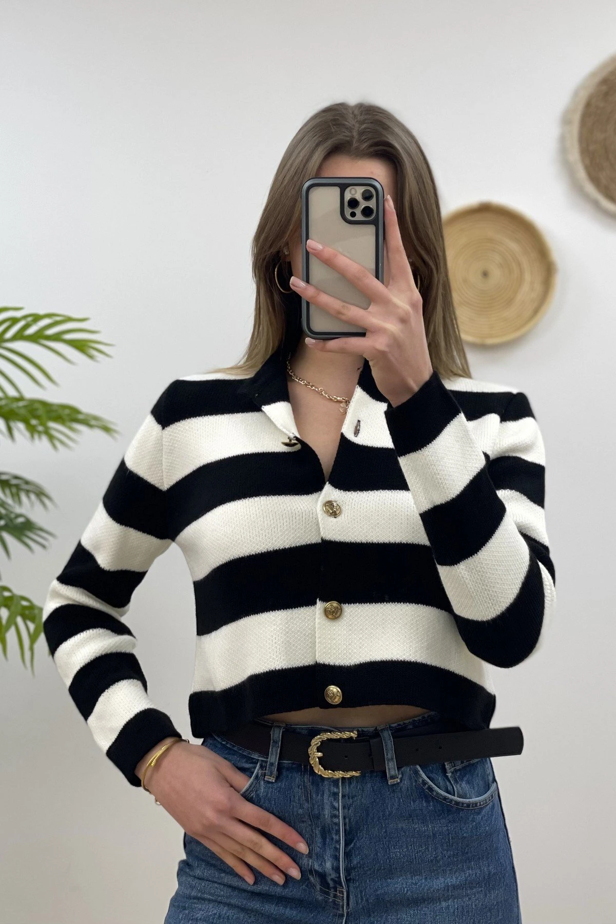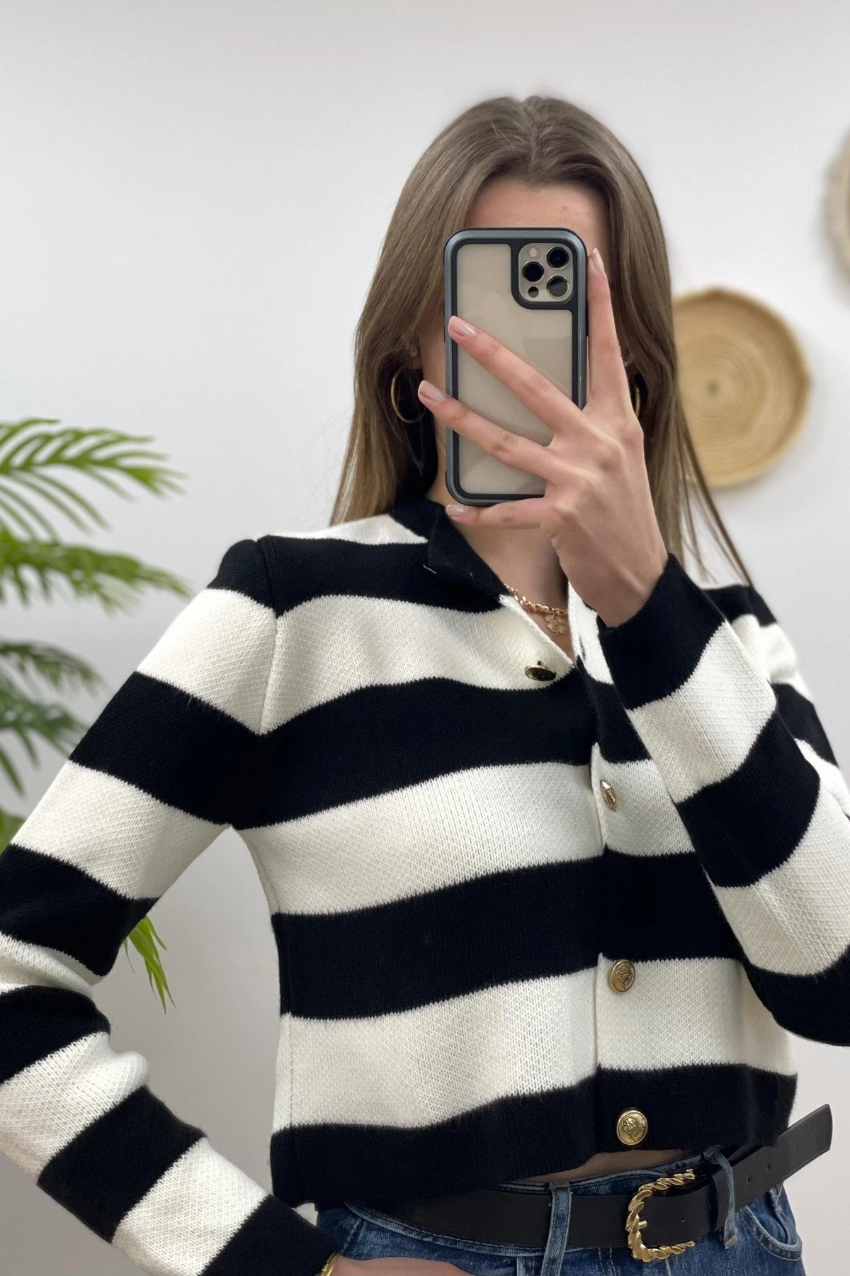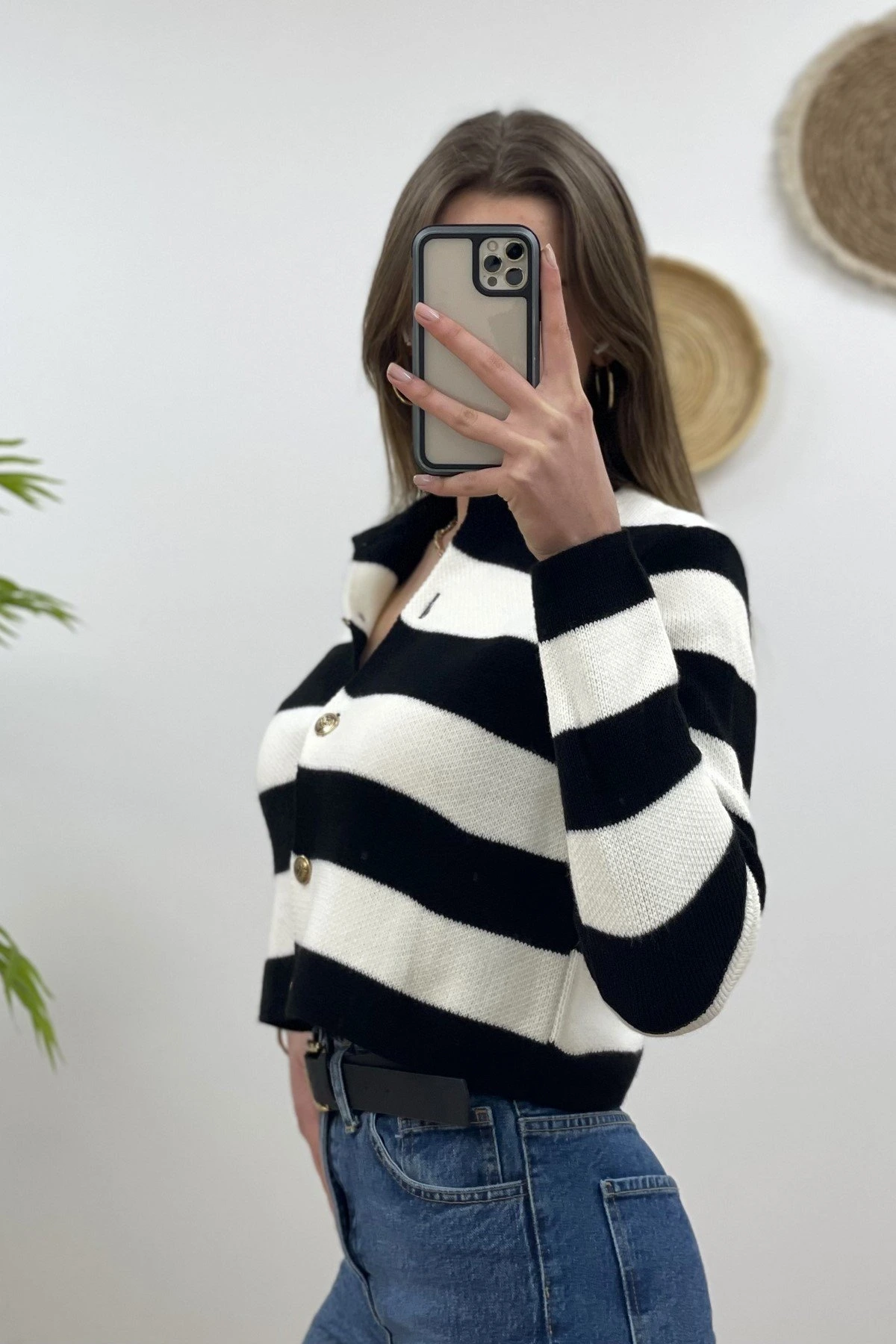 PİKE ÖRGÜ ÇİZGİLİ HIRKA – SİYAH EKRU
