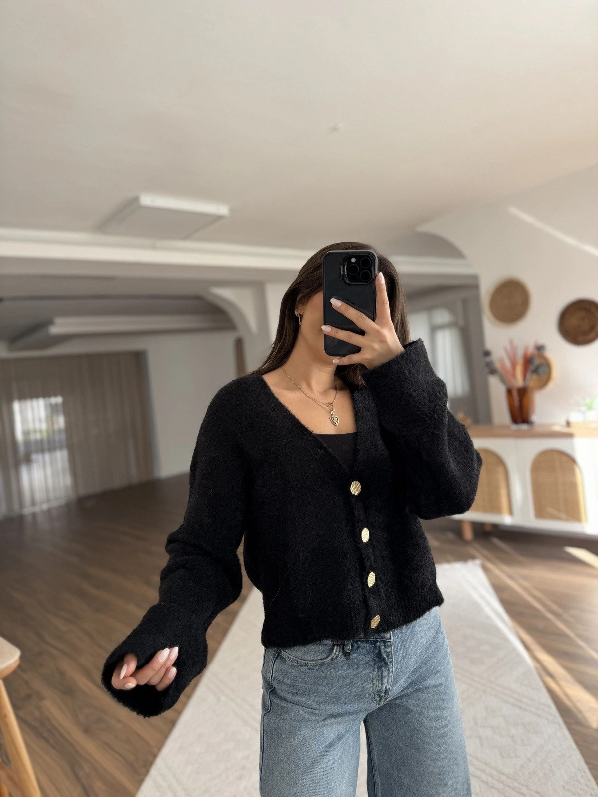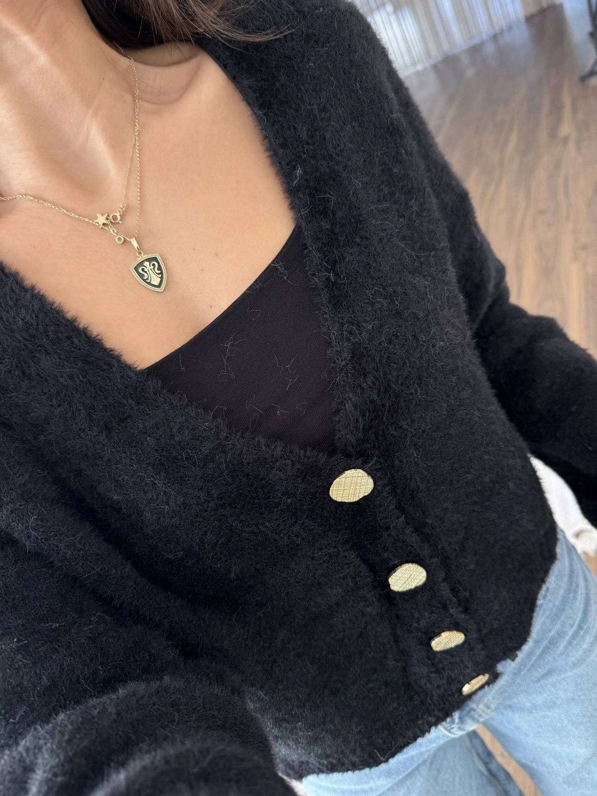SAKALLI GOLD DÜĞME CROP HIRKA – SİYAH