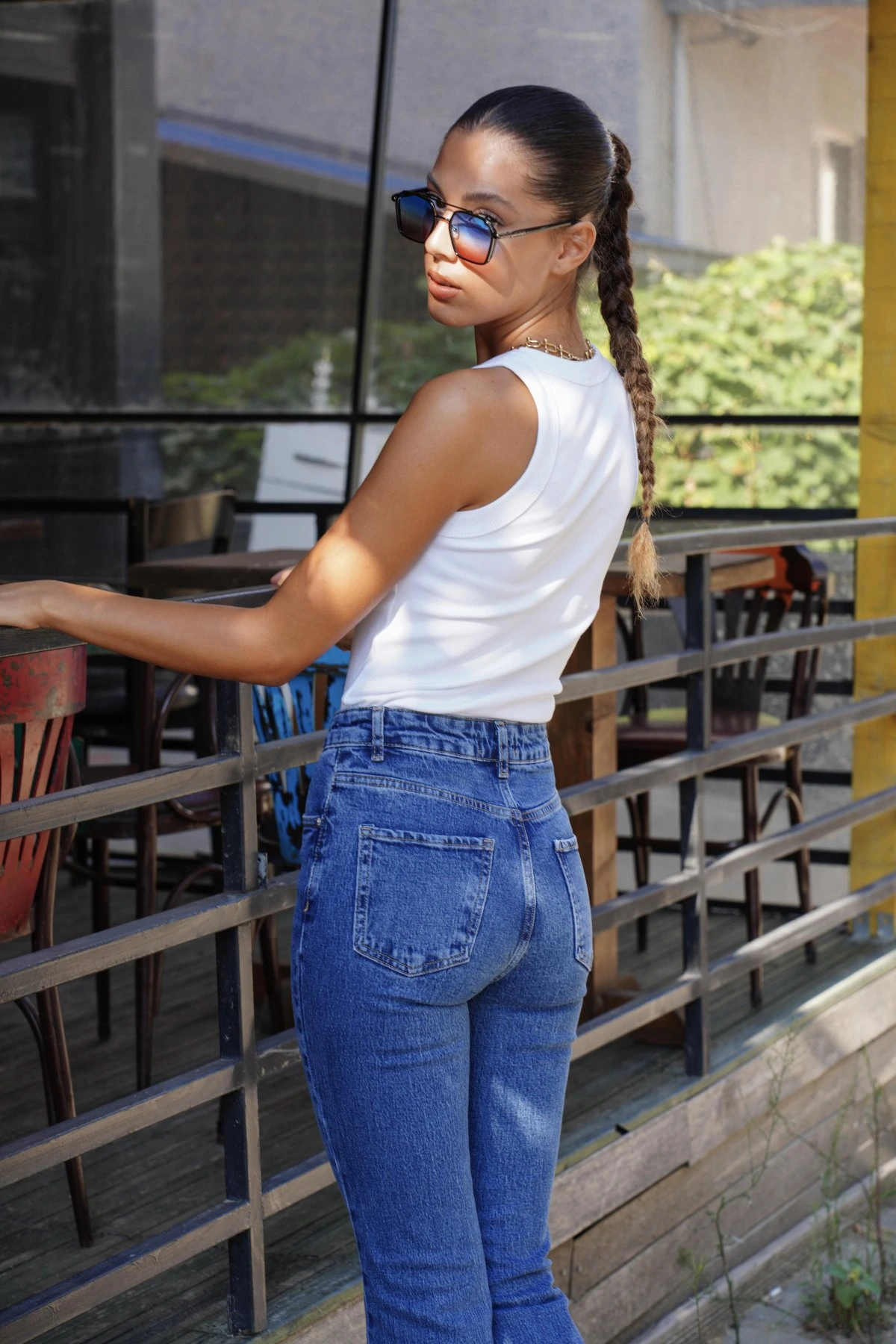 KESİK PAÇA YIKAMALI MOM JEAN - MAVİ