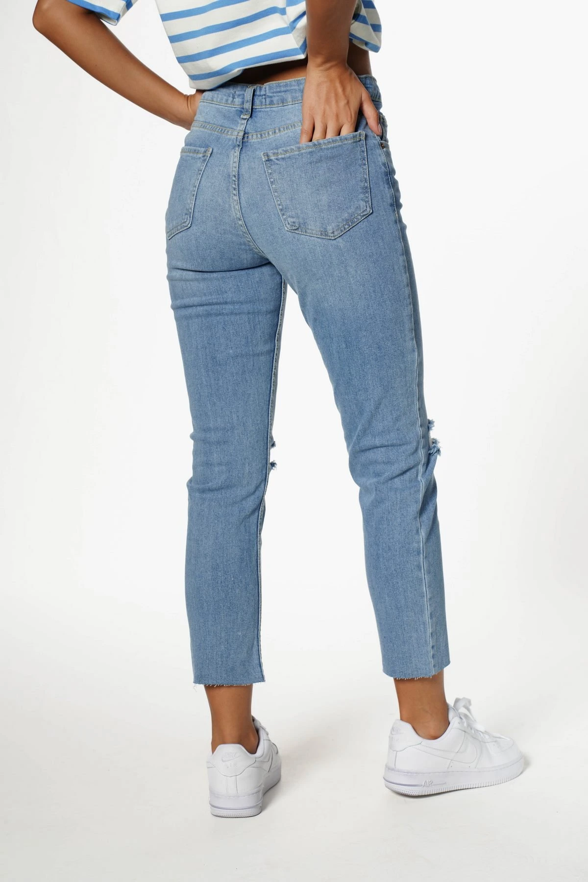 KESİK PAÇA YIRTIKLI LİKRALI BOYFİT JEAN – ORTA MAVİ