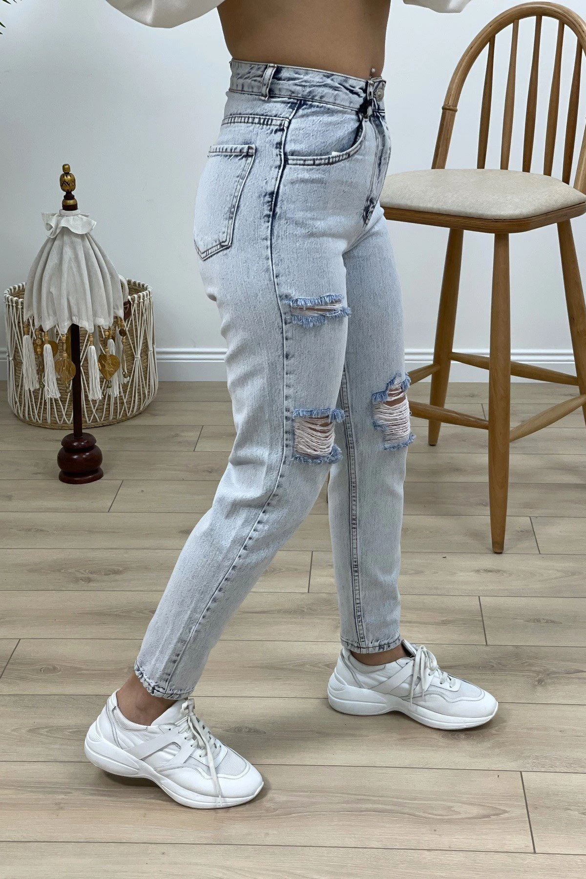 LAZERLİ YIRTIKLI MOM JEAN – BUZ MAVİ
