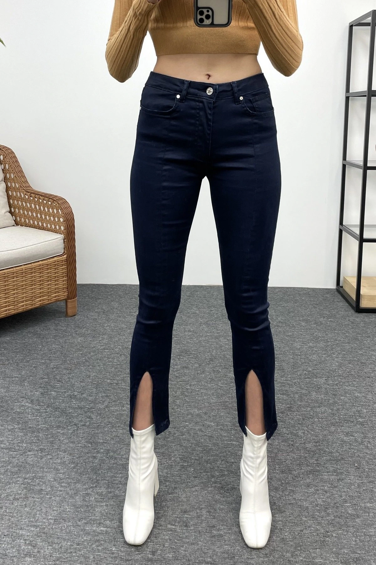 LİKRALI YIRTMAÇLI PAÇA PARLAK JEAN – KOYU MAVİ
