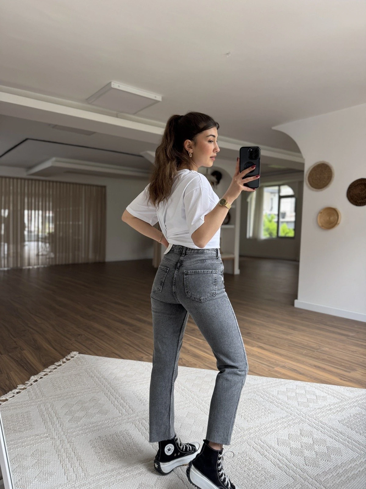 MARKA MODEL YÜKSEK BEL LİKRALI BOYFİT JEAN – KOYU GRİ