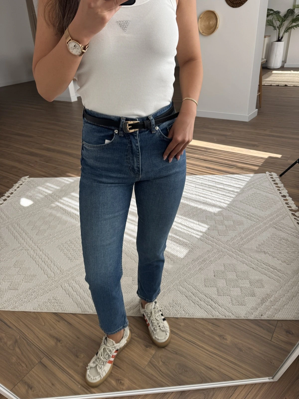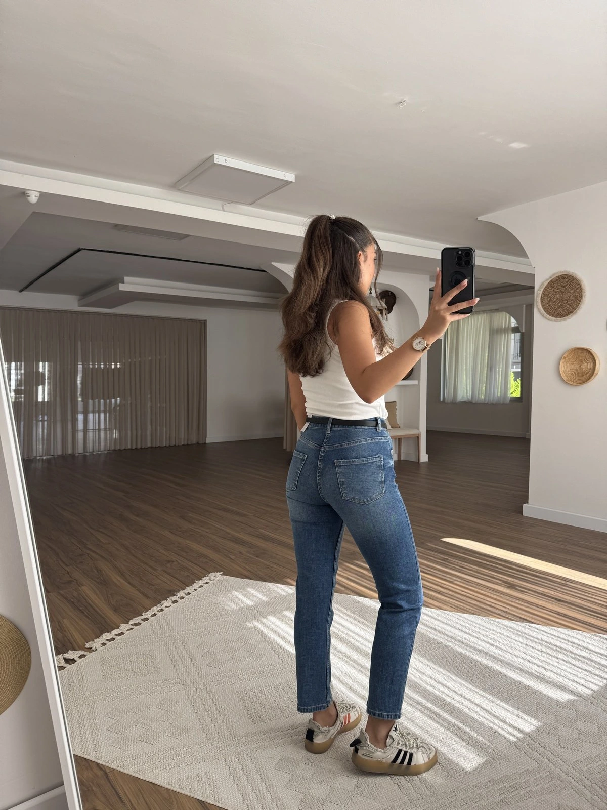 MARKA MODEL YÜKSEK BEL LİKRALI MOM JEAN – MAVİ