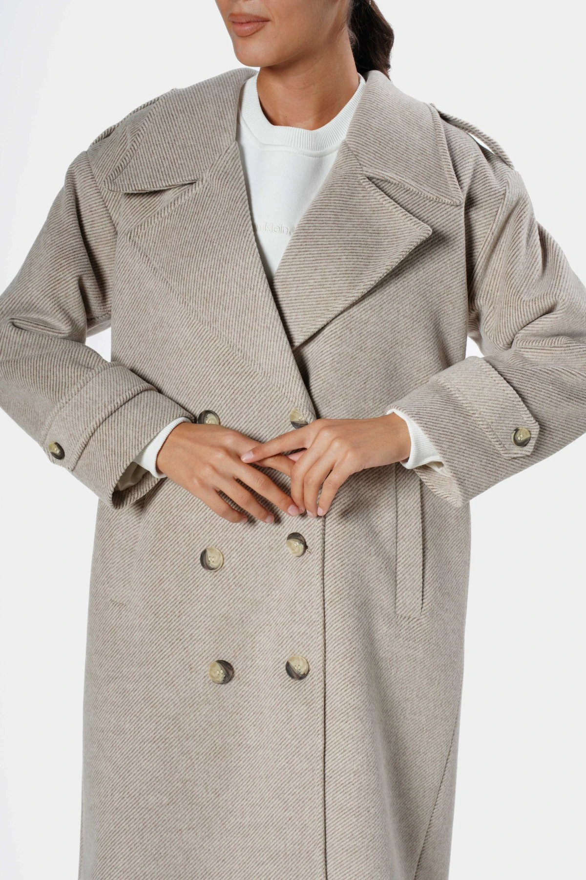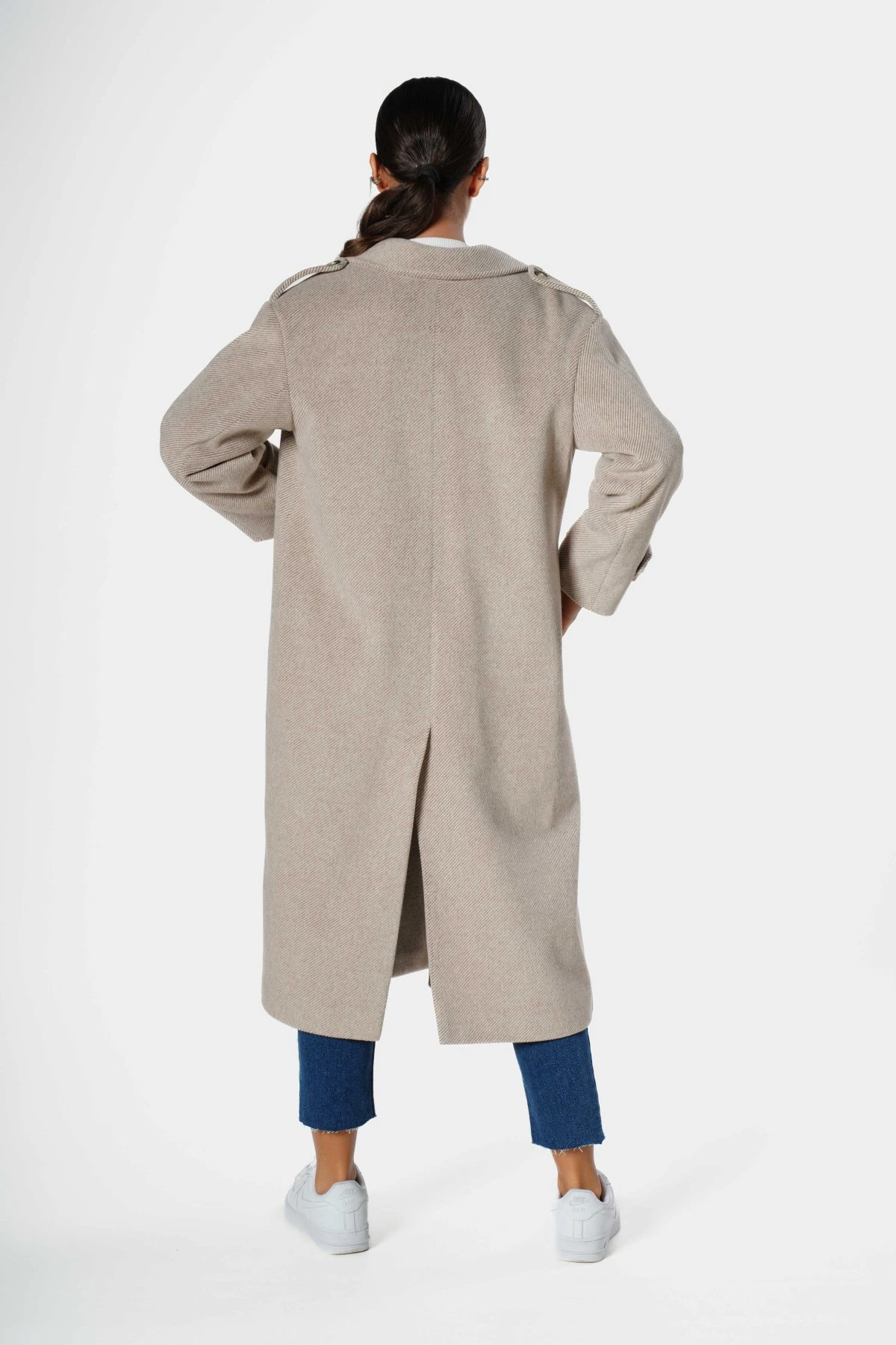 OMUZ APOLETLİ ARKA YIRTMAÇ DOKULU UZUN KAŞE KABAN – VİZON