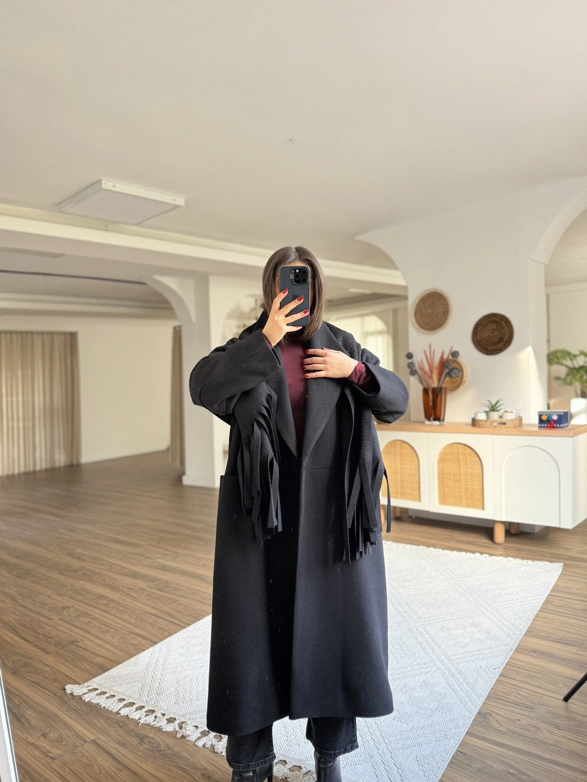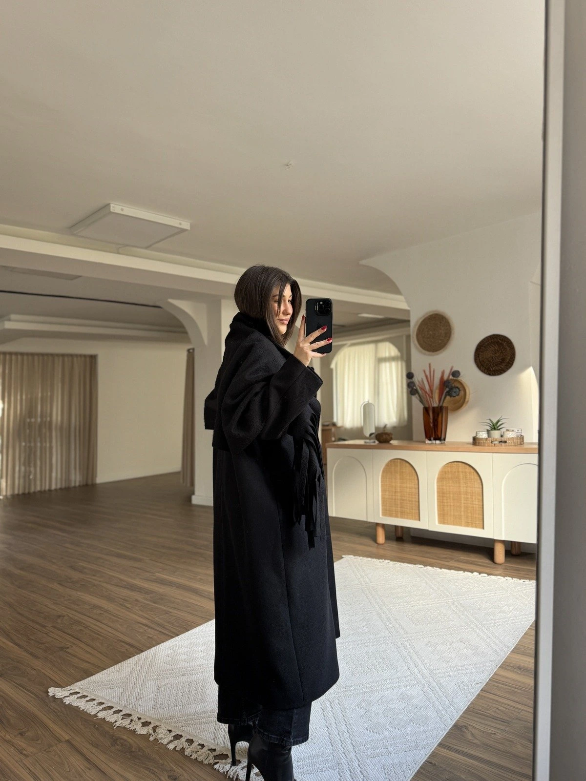 OVERSİZE GENİŞ YAKA ATKILI KAŞE KABAN – SİYAH