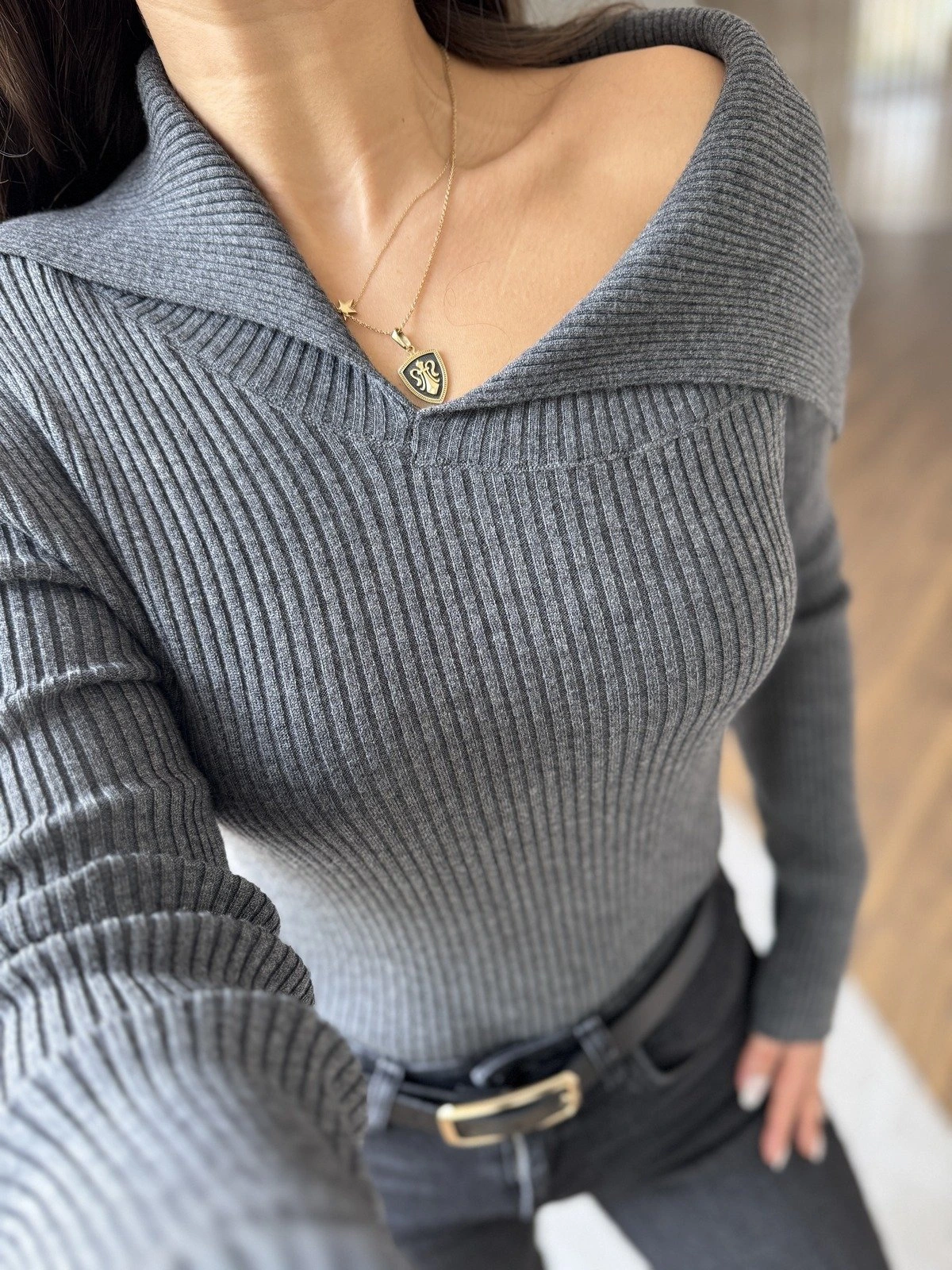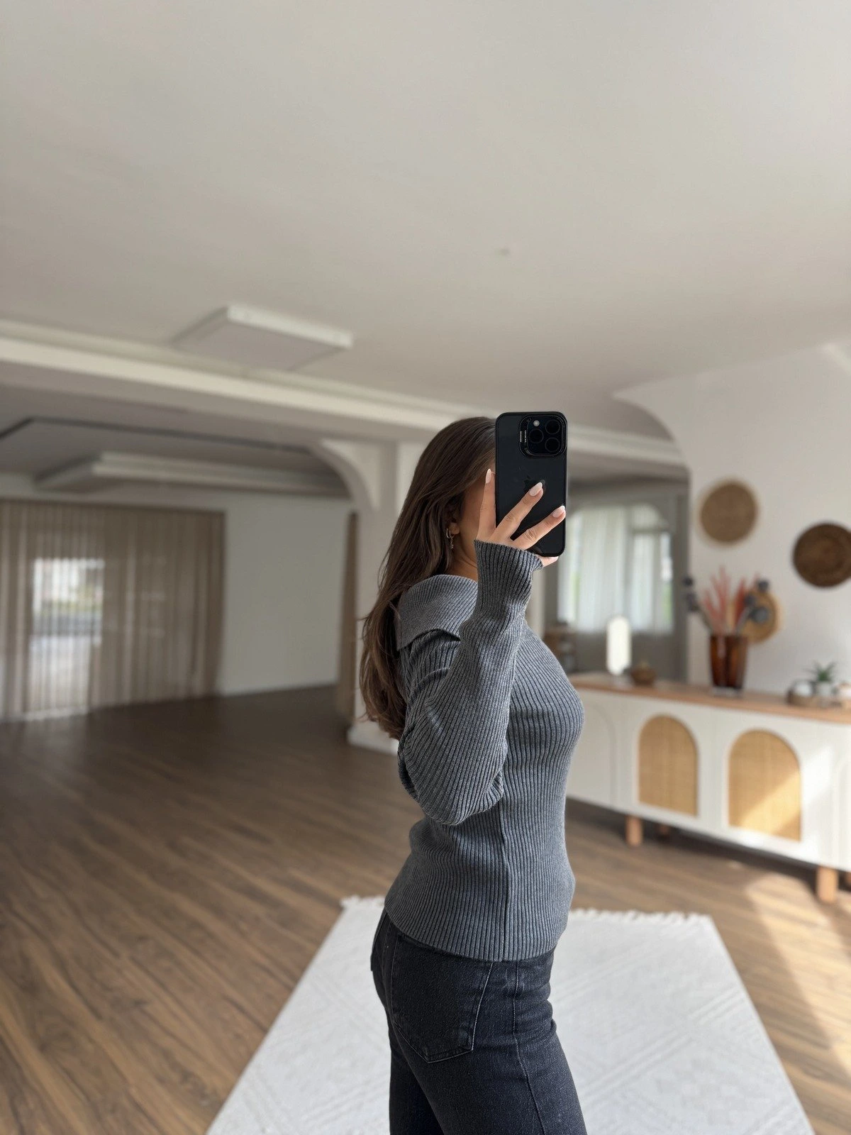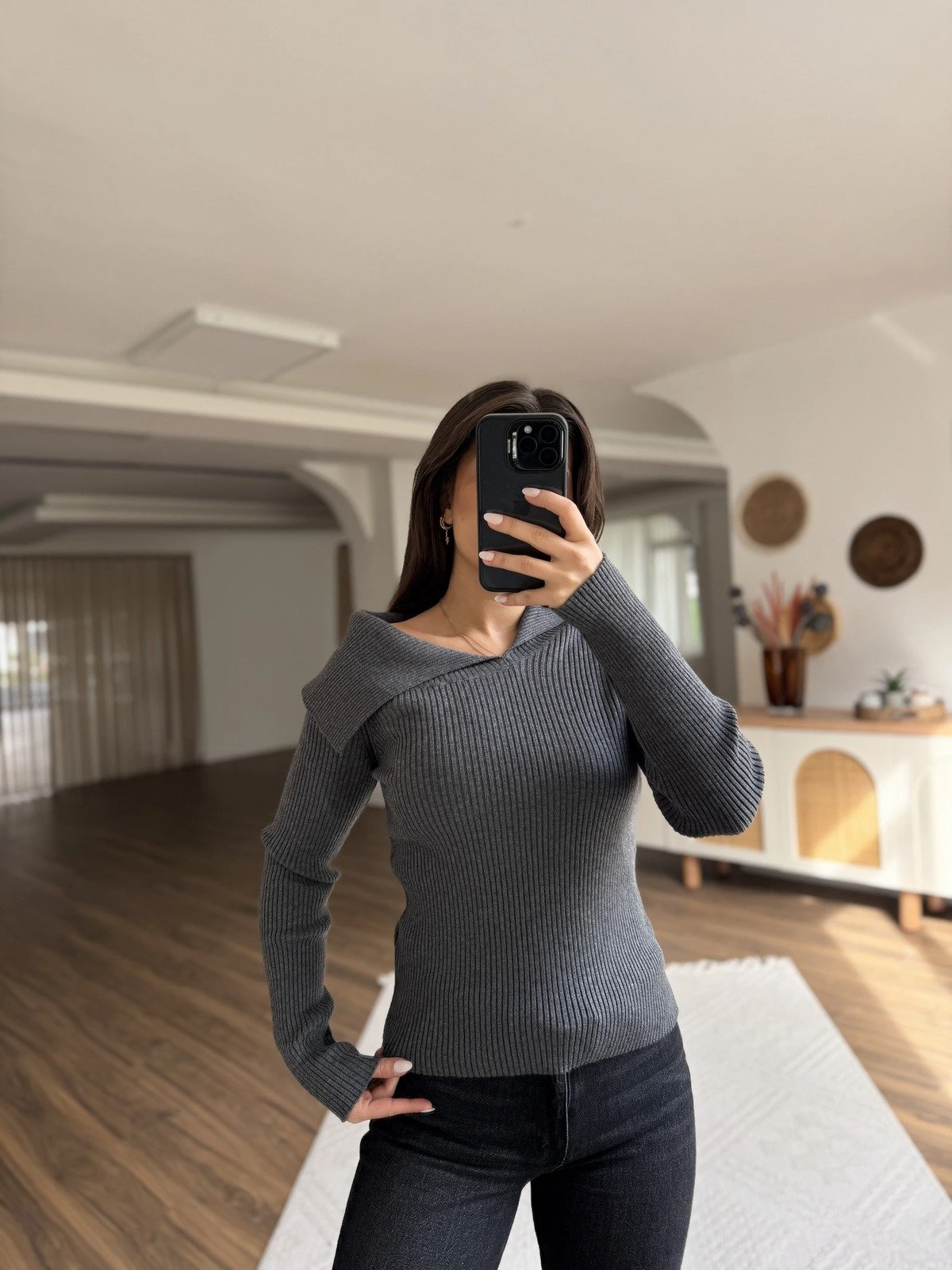 ASİMETRİK KAT YAKA YÜN KARIŞIM KAZAK – FÜME MELANJ