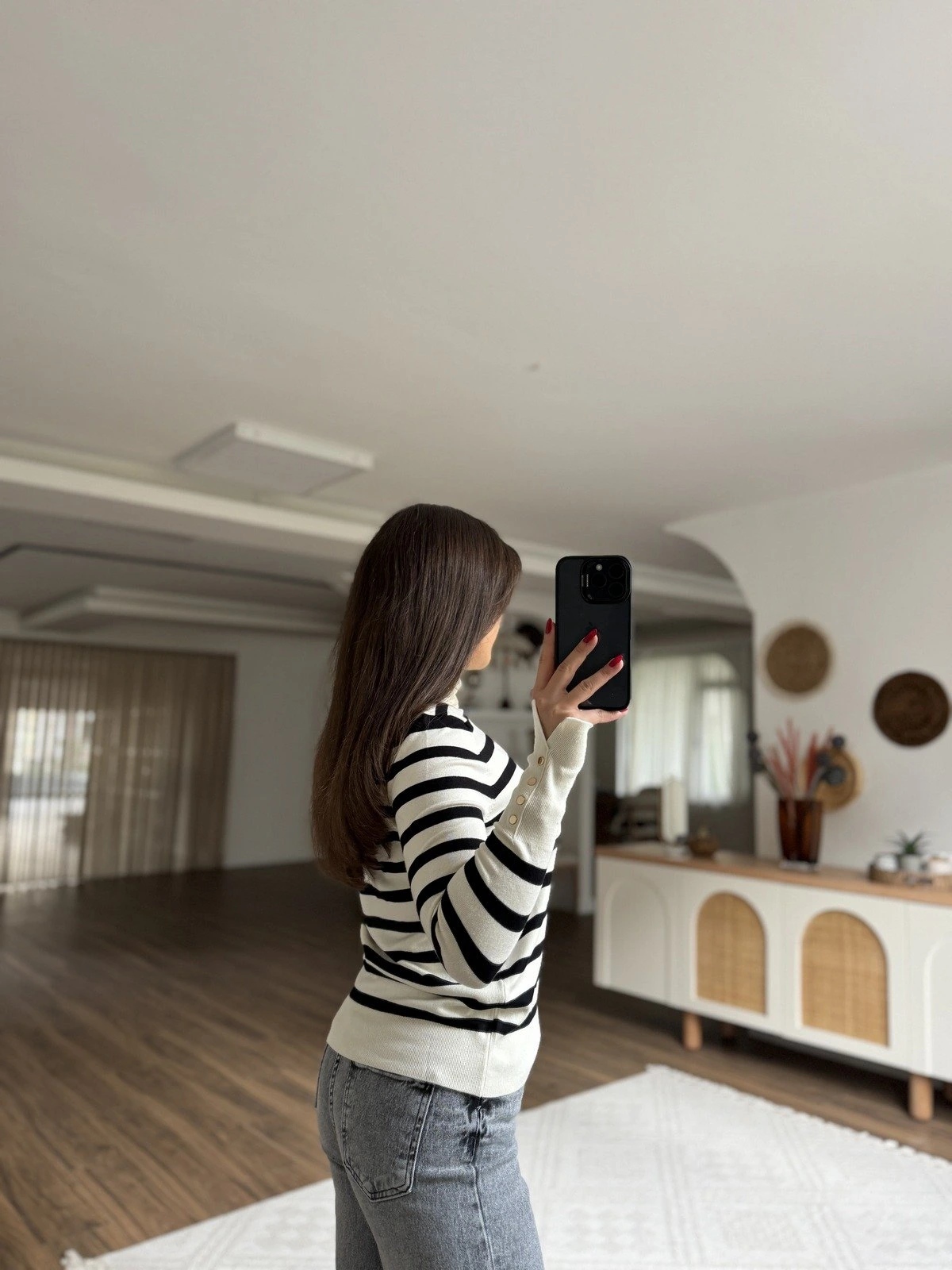 BALIKÇI YAKA ÇİZGİLİ DROPLU VİSKON KAZAK – KREM SİYAH
