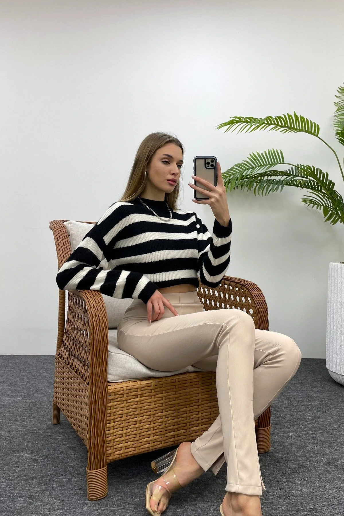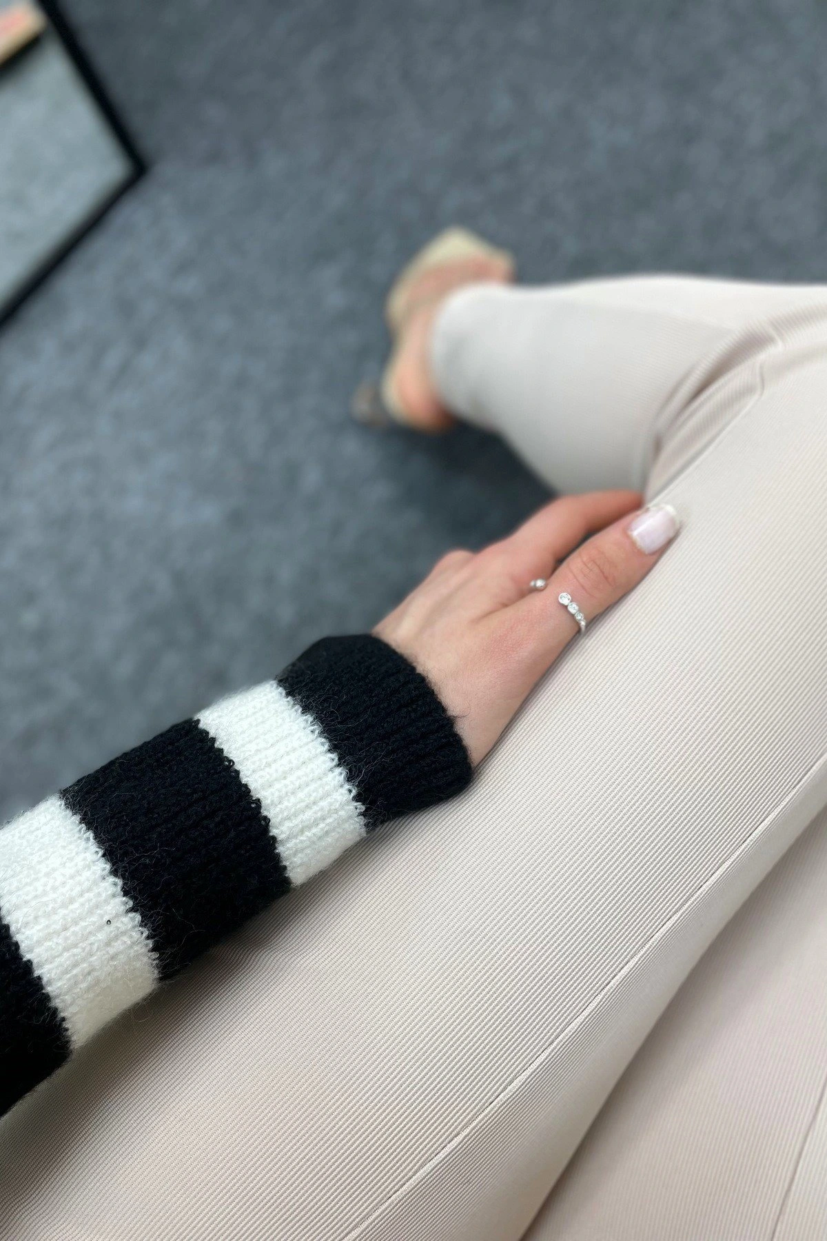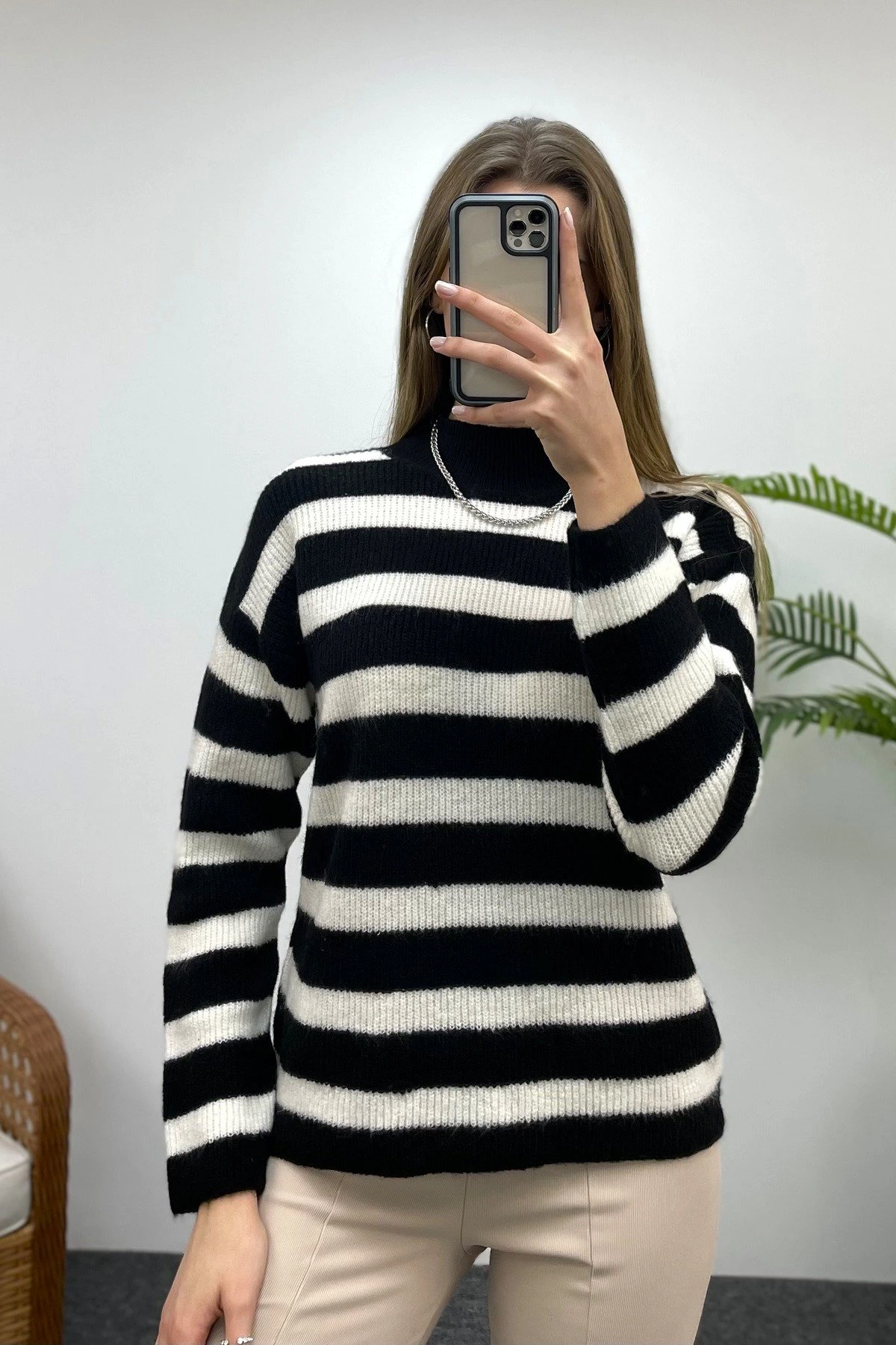 BALIKÇI YAKA ÇİZGİLİ KAZAK – SİYAH EKRU