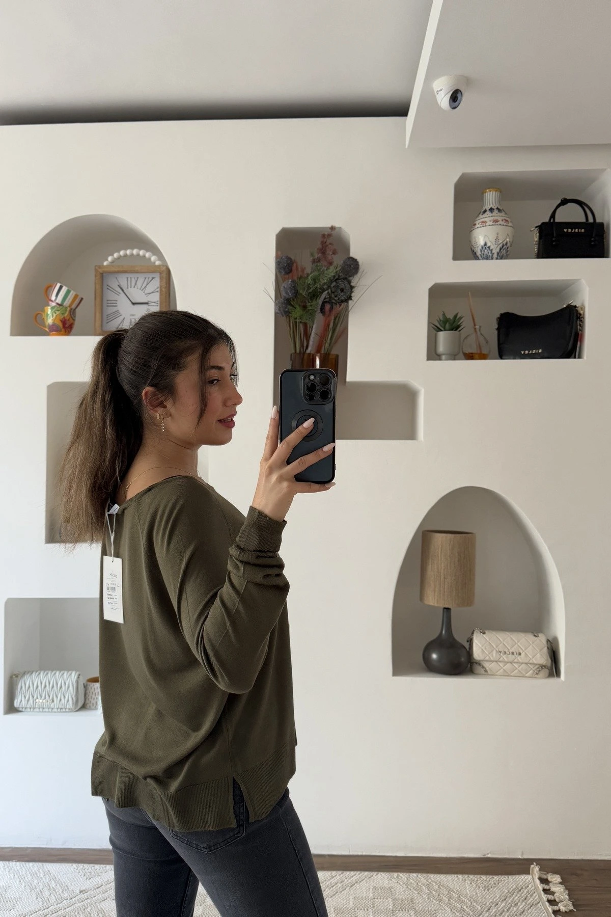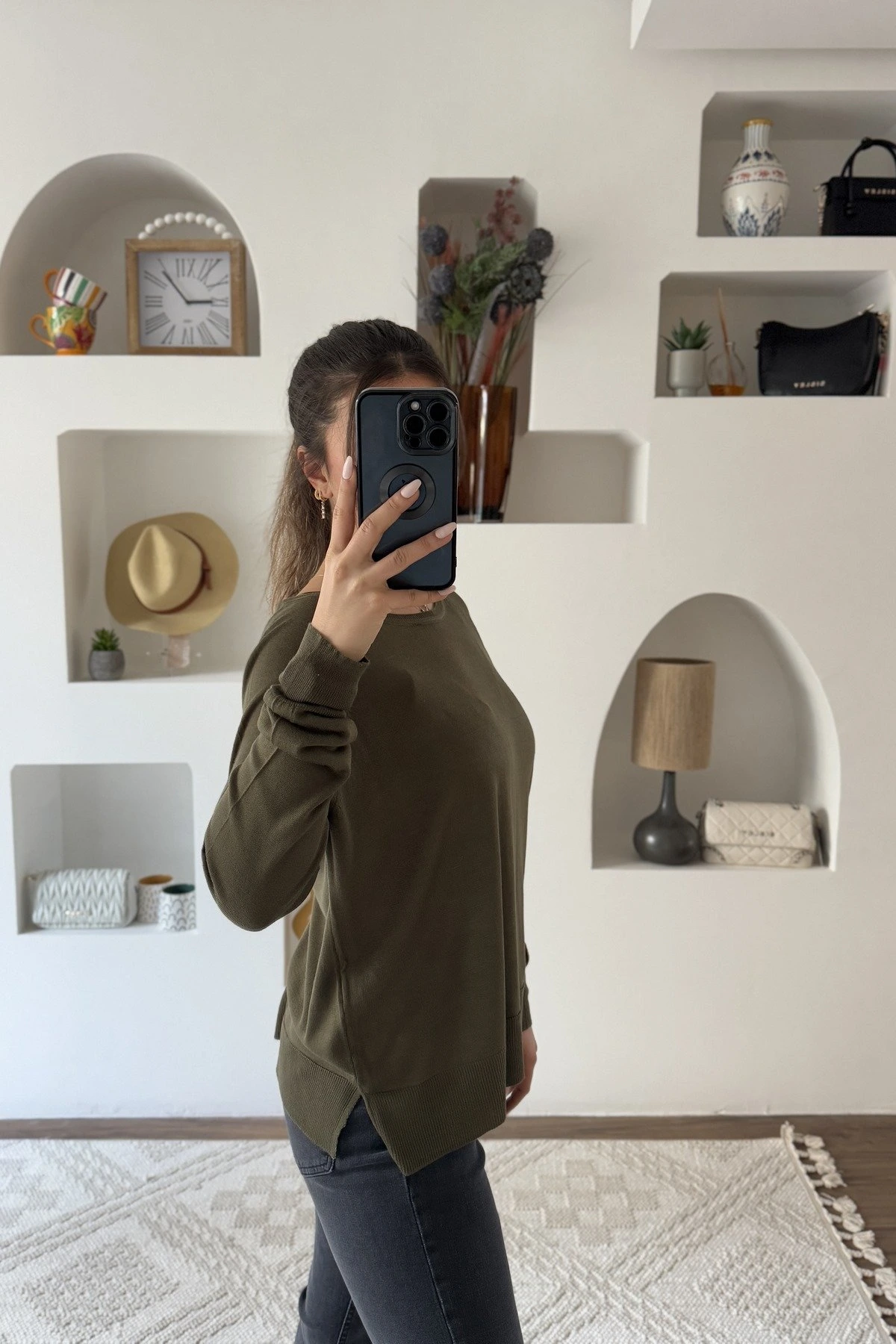 BİSİKLET YAKA ETEĞİ YIRTMAÇ BASİC İNCE VİSKON KAZAK – HAKİ