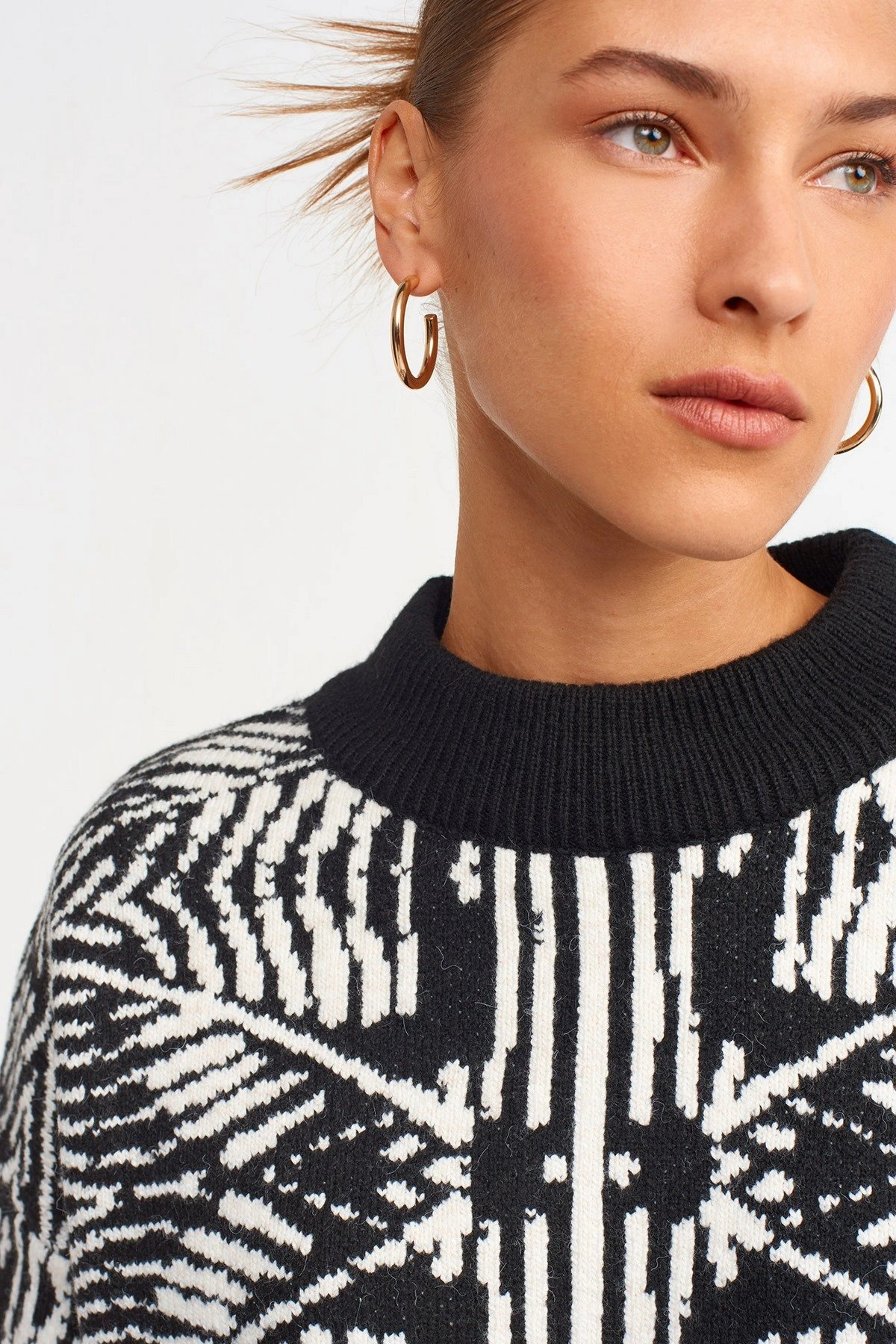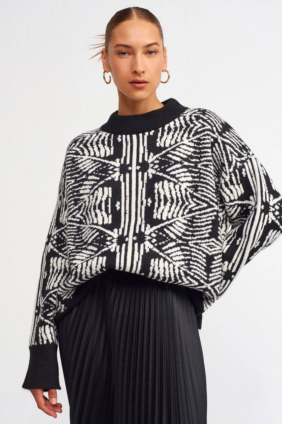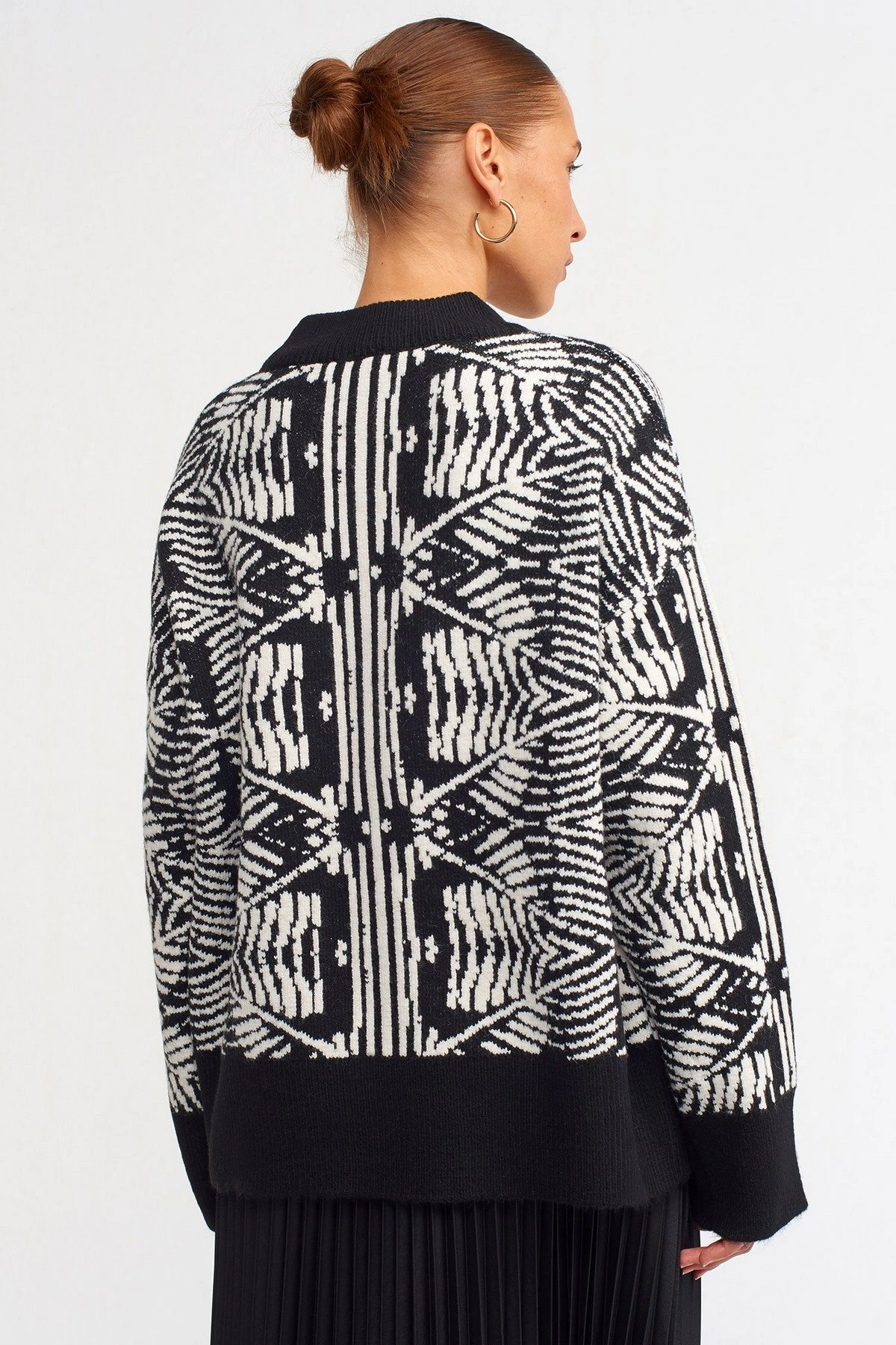 BİSİKLET YAKA ETNİK DESEN KAZAK – SİYAH BEYAZ