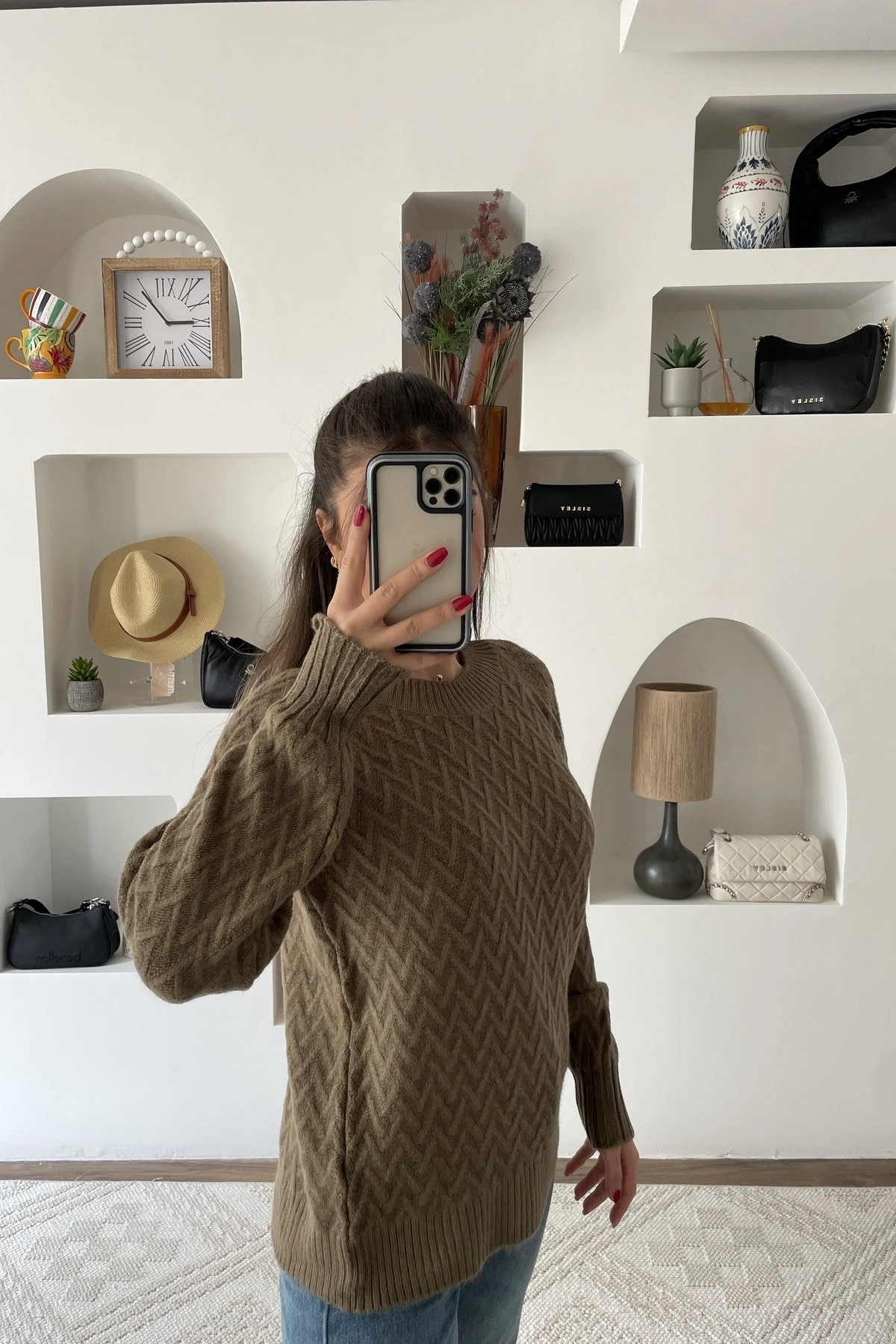 BİSİKLET YAKA REGLAN KOL V DOKUMA VİSKON KAZAK – AÇIK KAHVE
