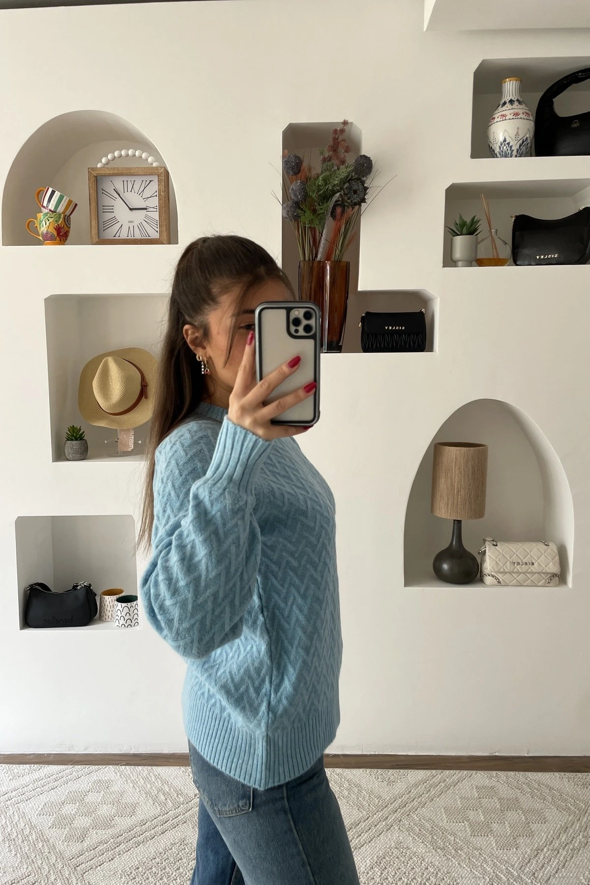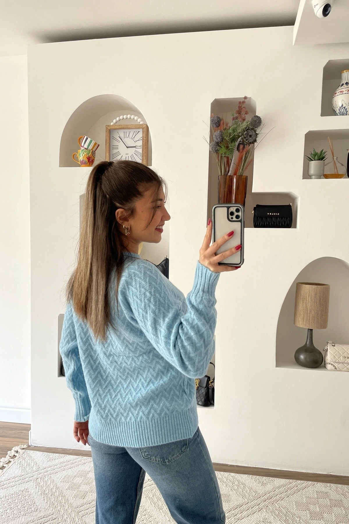 BİSİKLET YAKA REGLAN KOL V DOKUMA VİSKON KAZAK – BEBE MAVİ