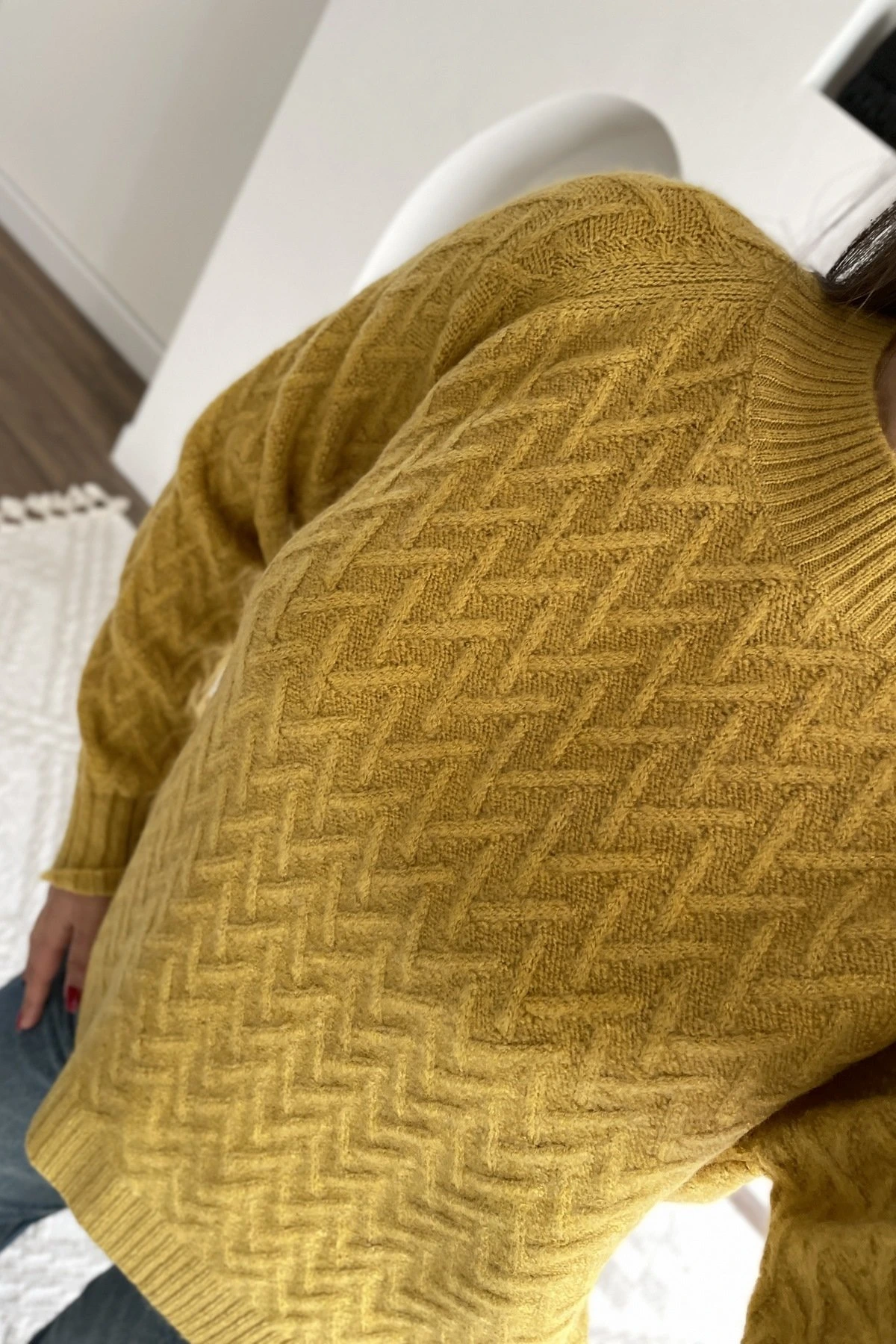 BİSİKLET YAKA REGLAN KOL V DOKUMA VİSKON KAZAK – HARDAL