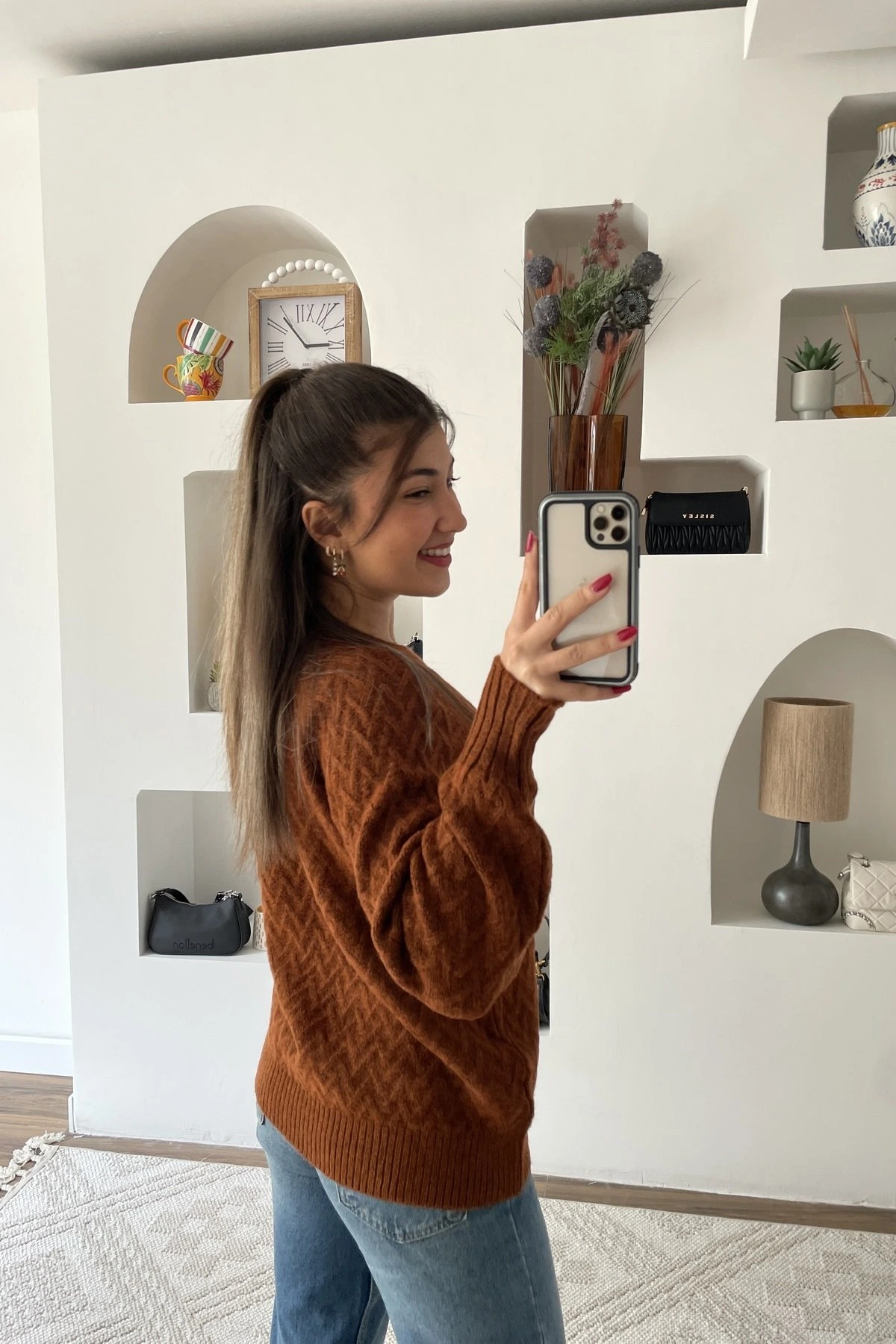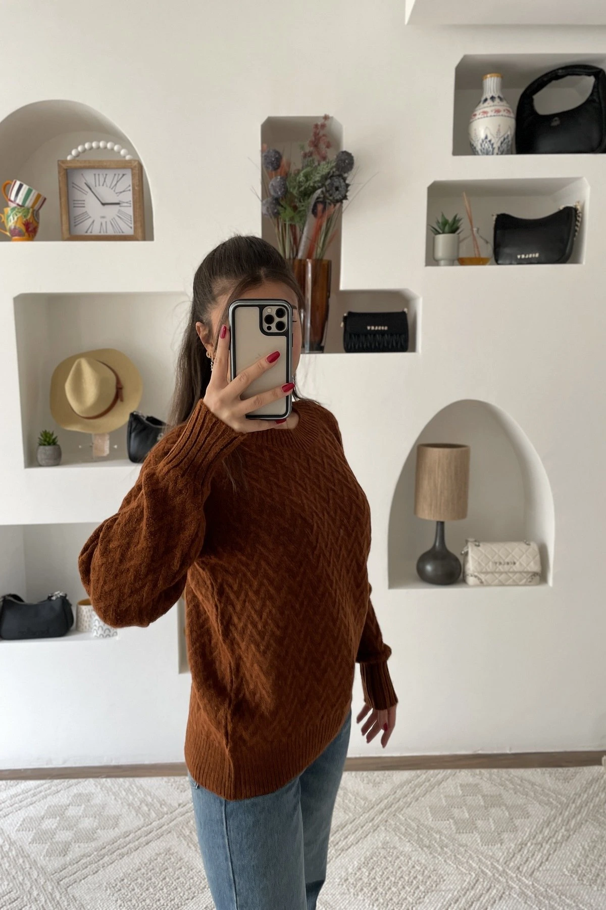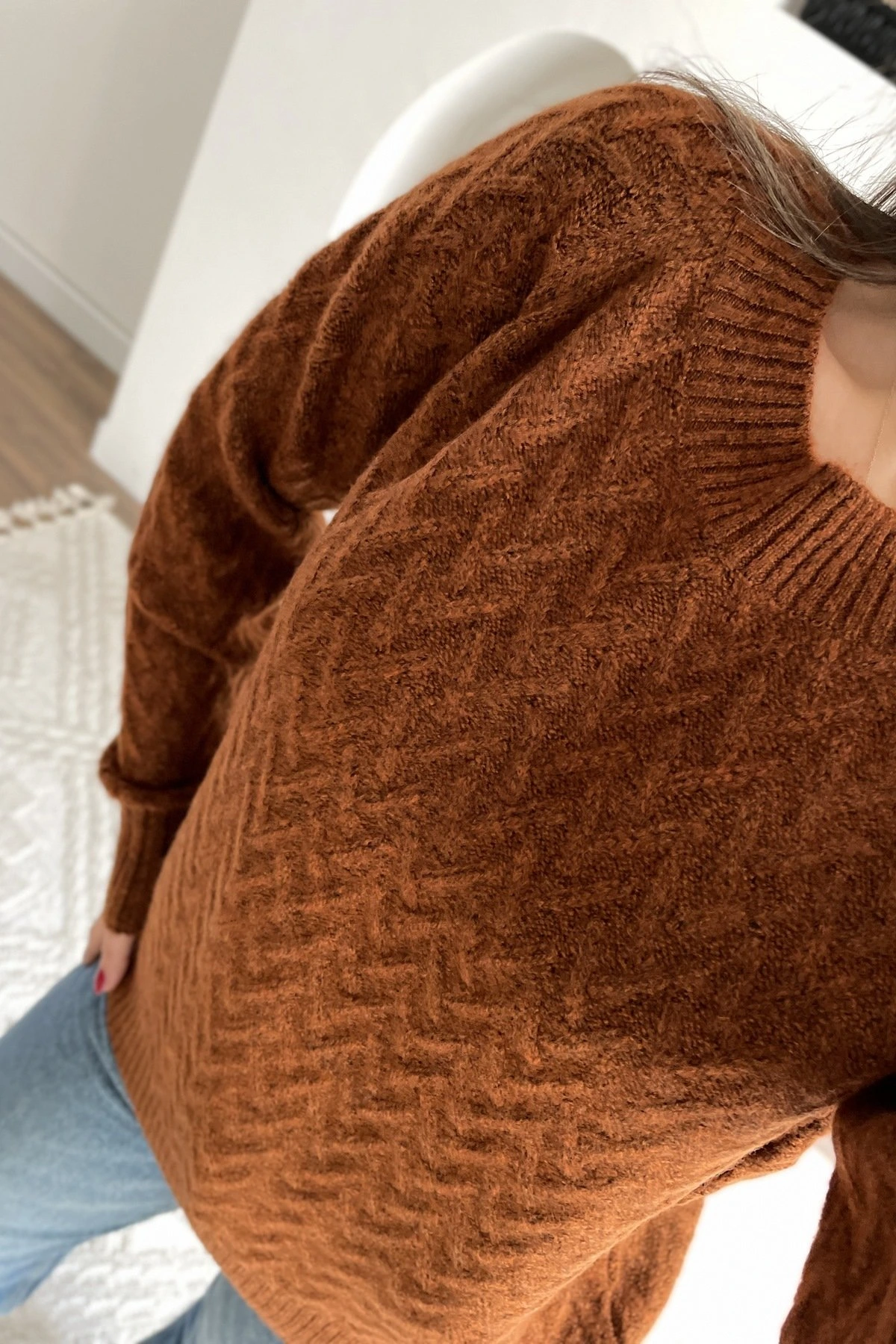 BİSİKLET YAKA REGLAN KOL V DOKUMA VİSKON KAZAK - KAHVE