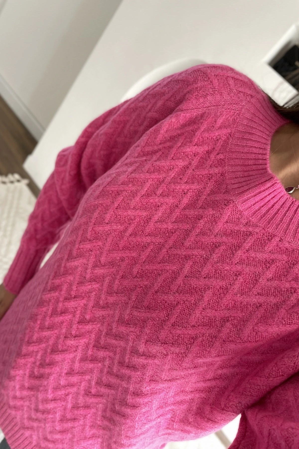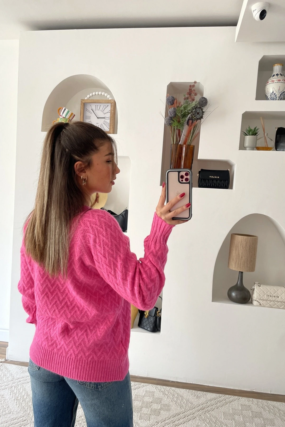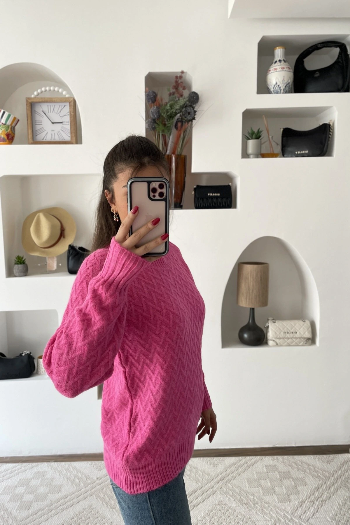 BİSİKLET YAKA REGLAN KOL V DOKUMA VİSKON KAZAK – PEMBE