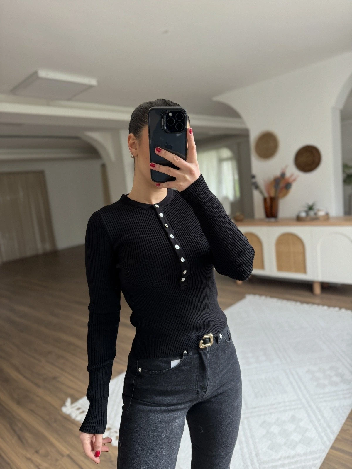 BİSİKLET YAKA YARI PATLI FİTİLLİ VİSKON KAZAK – SİYAH