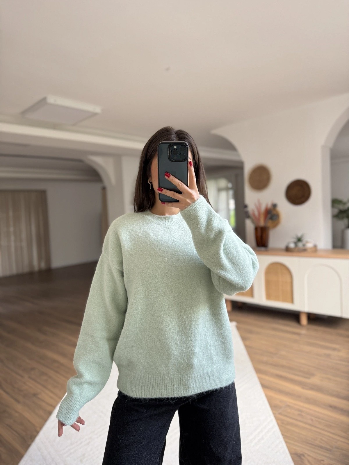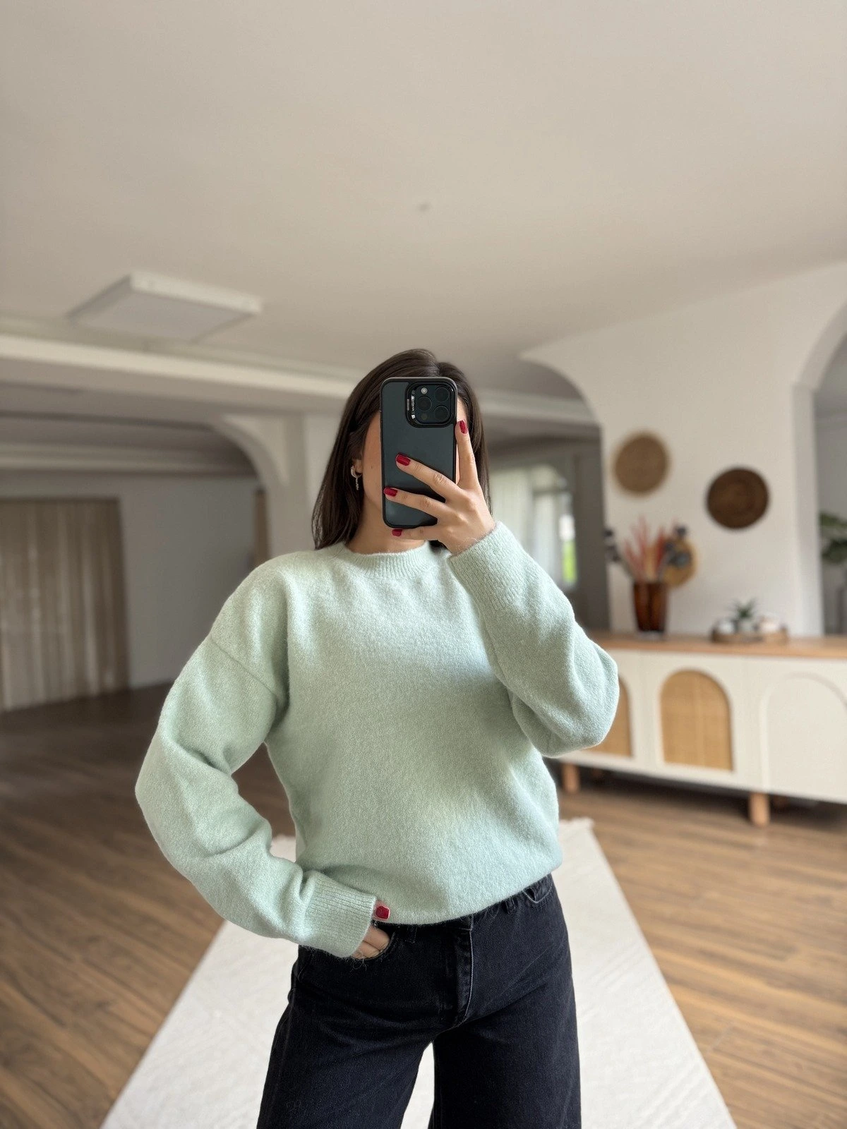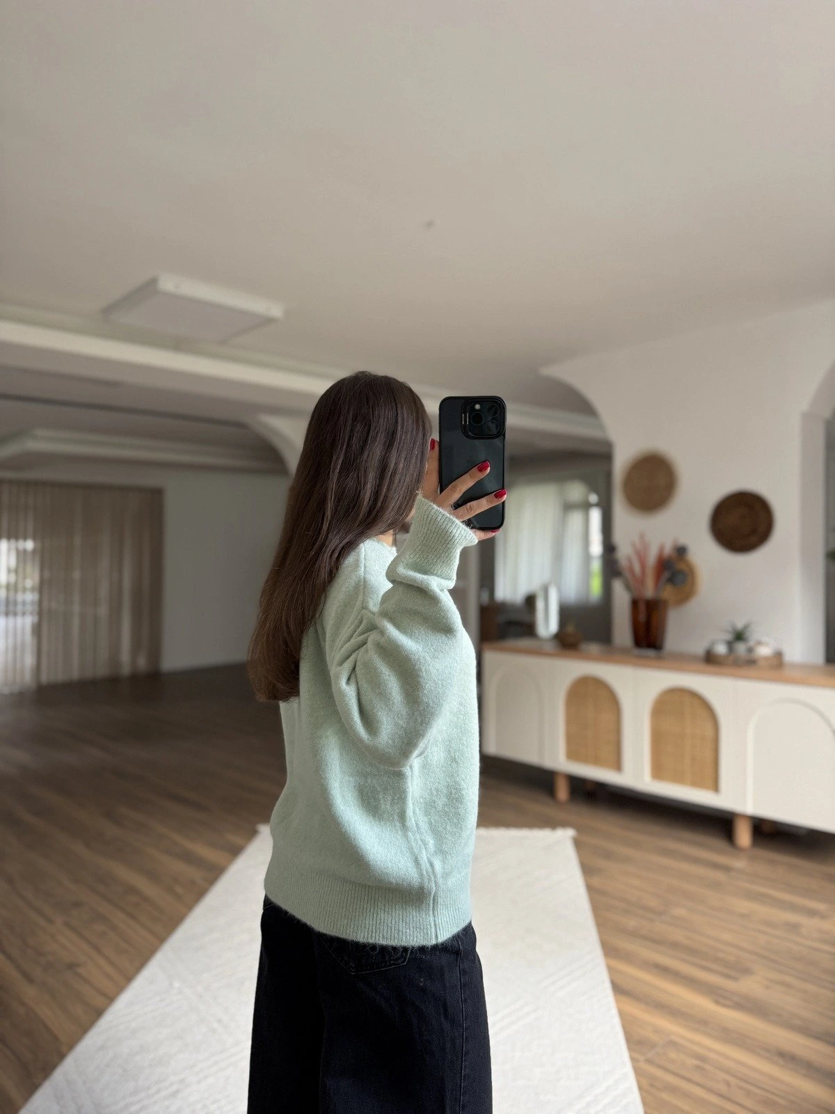 BİSİKLET YAKA YUMUŞAK DOKU YÜN KARIŞIMLI DÜŞÜK OMUZ KAZAK – KOYU MİNT