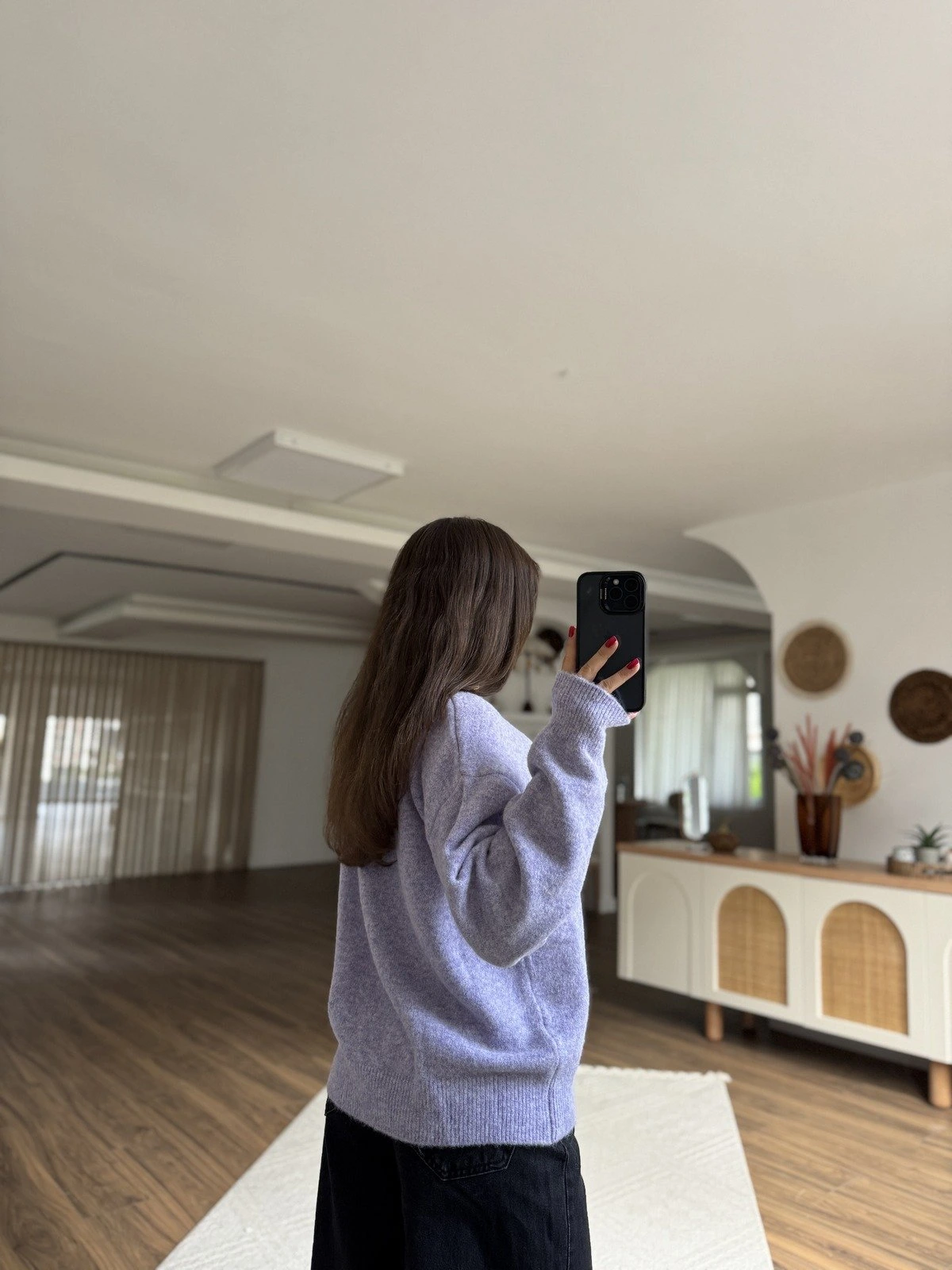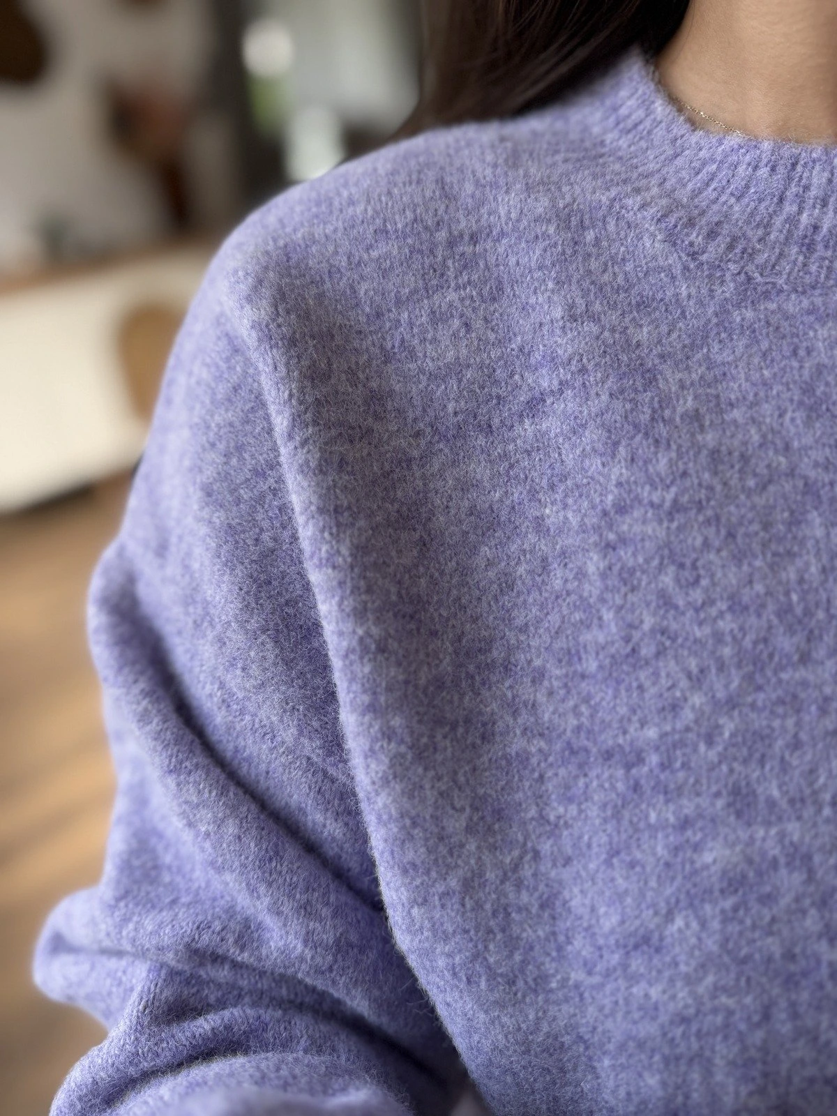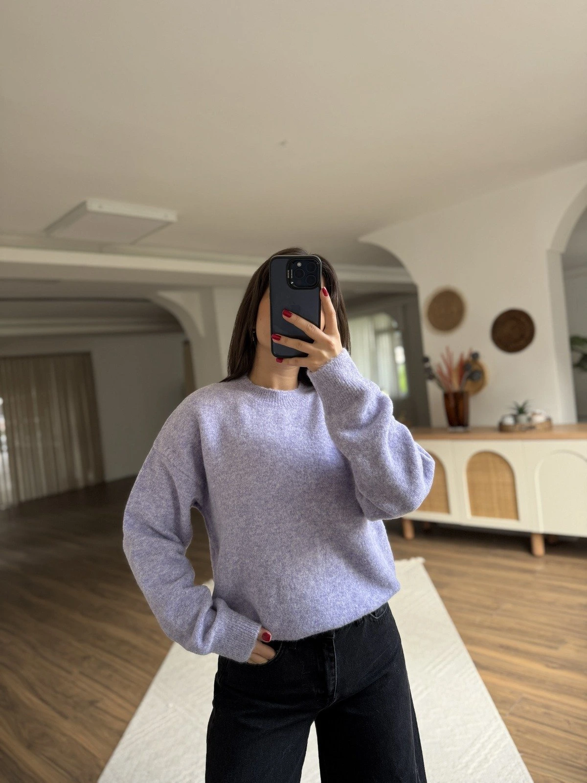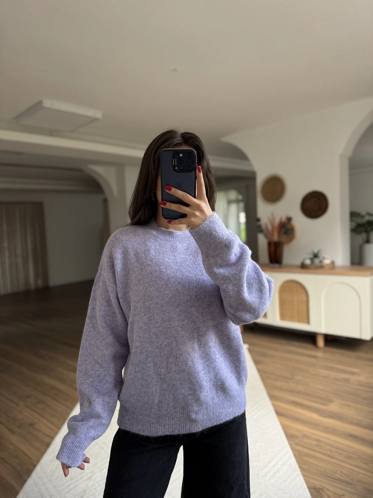 BİSİKLET YAKA YUMUŞAK DOKU YÜN KARIŞIMLI DÜŞÜK OMUZ KAZAK – LİLA