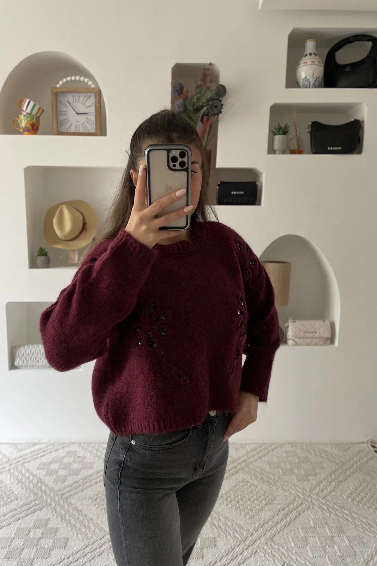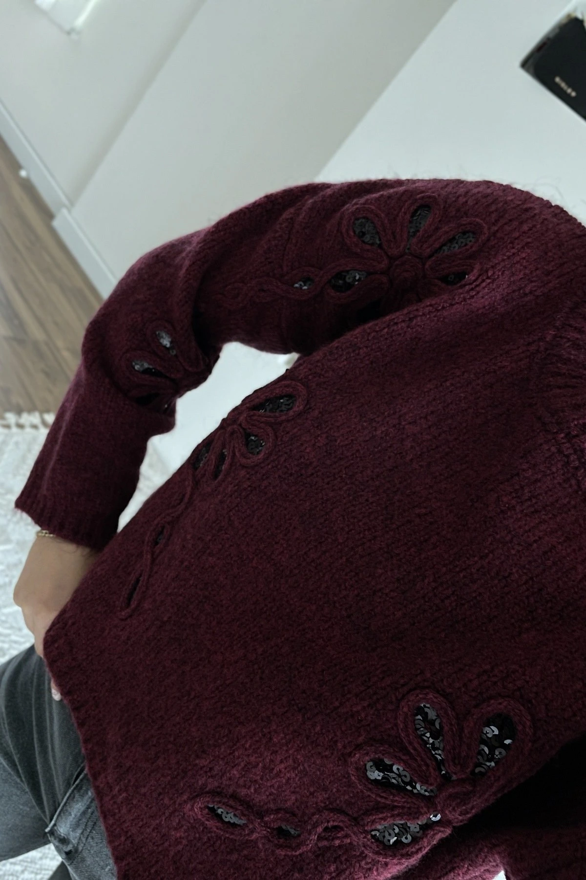ÇİÇEK DOKUMA PAYET İŞLEME BİSİKLET YAKA KAZAK – BORDO