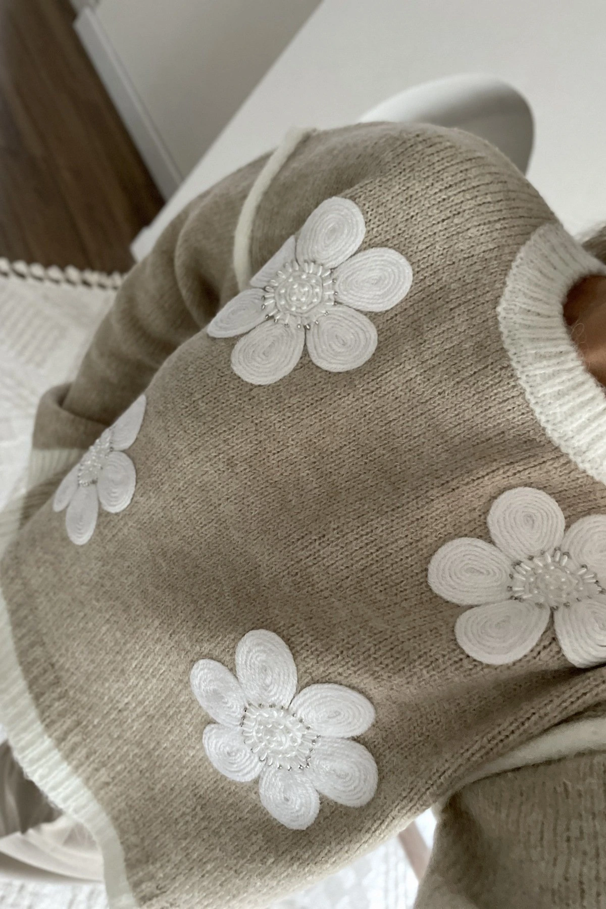 ÇİÇEK MOTİF İNCİ DETAY BİSİKLET YAKA KAZAK – TAŞ
