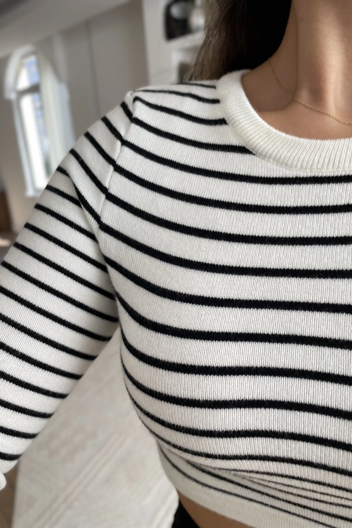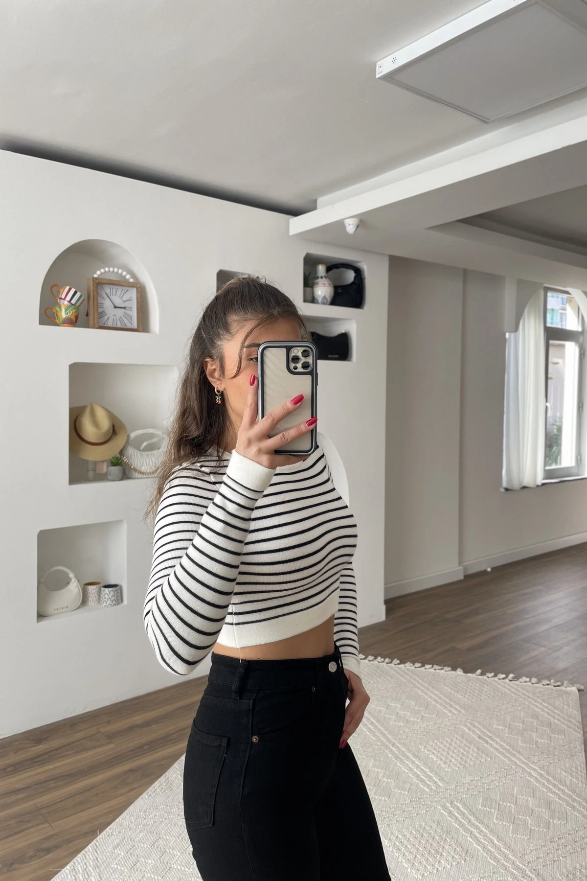 ÇİZGİLİ BİSİKLET YAKA VİSKON CROP KAZAK – EKRU SİYAH