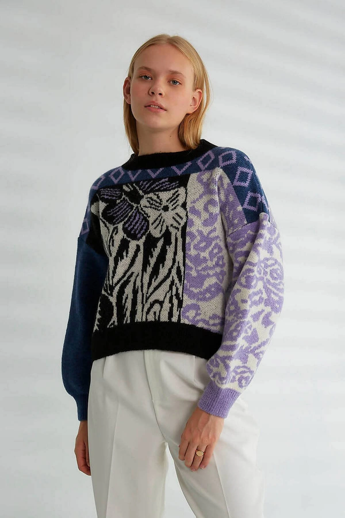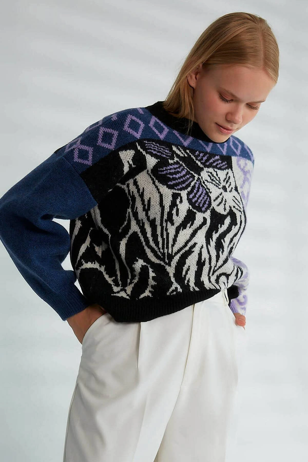 DESENLİ BİSİKLET YAKA KISA KAZAK – SİYAH