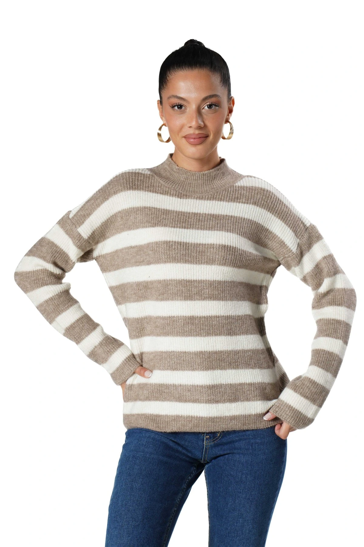 DİK YAKA BEL BİLEK VE DÜZ ÇİZGİLİ VİSKON KAZAK – CAMEL EKRU