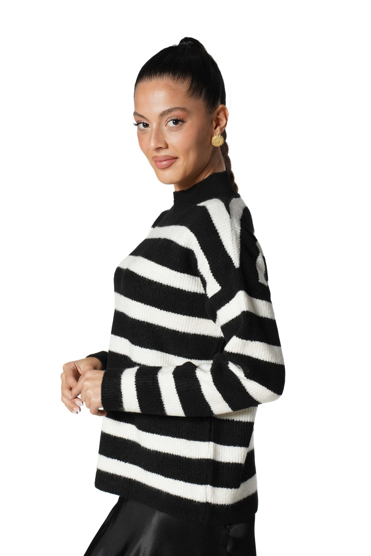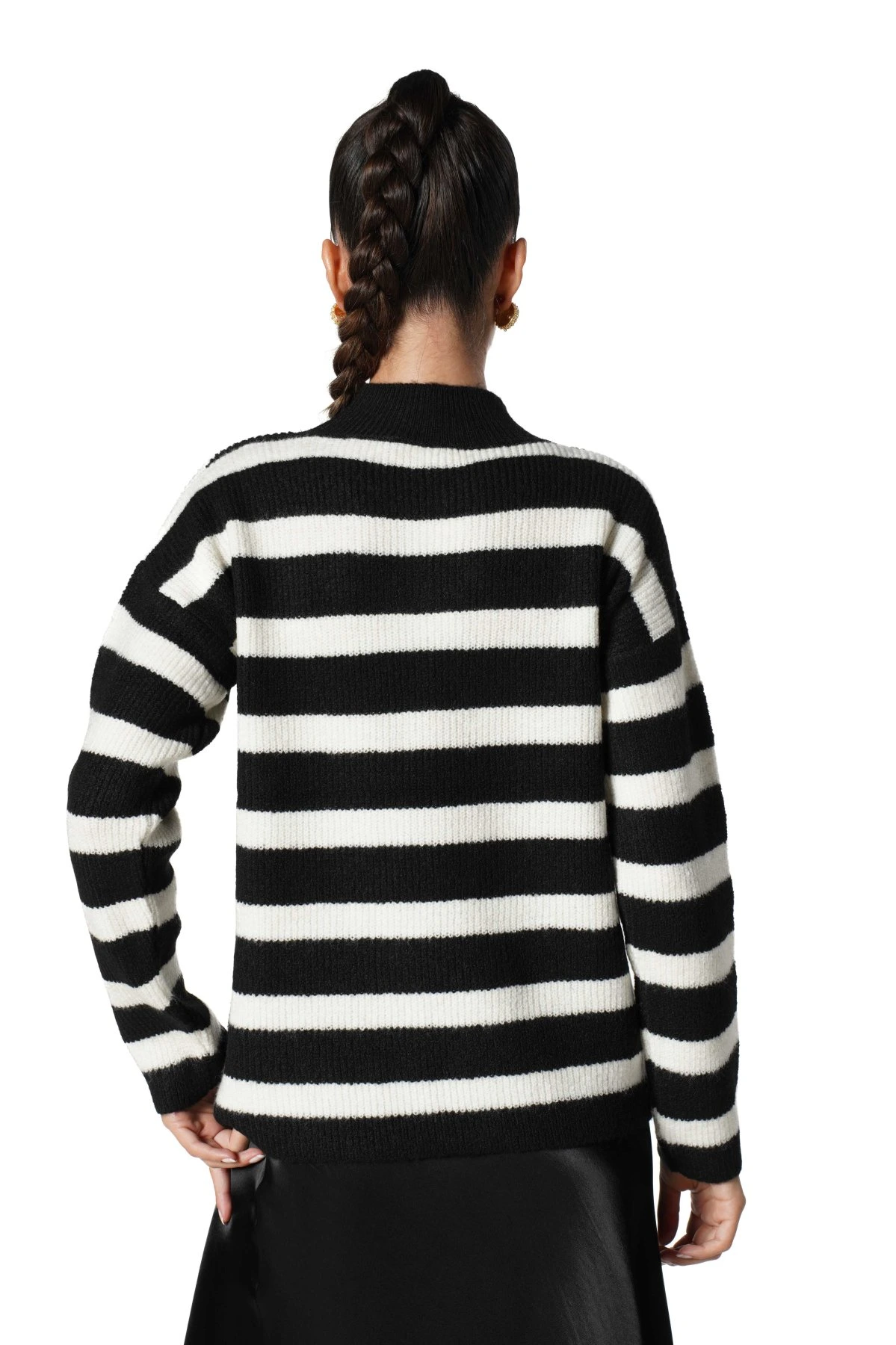DİK YAKA BEL BİLEK VE DÜZ ÇİZGİLİ VİSKON KAZAK – SİYAH EKRU