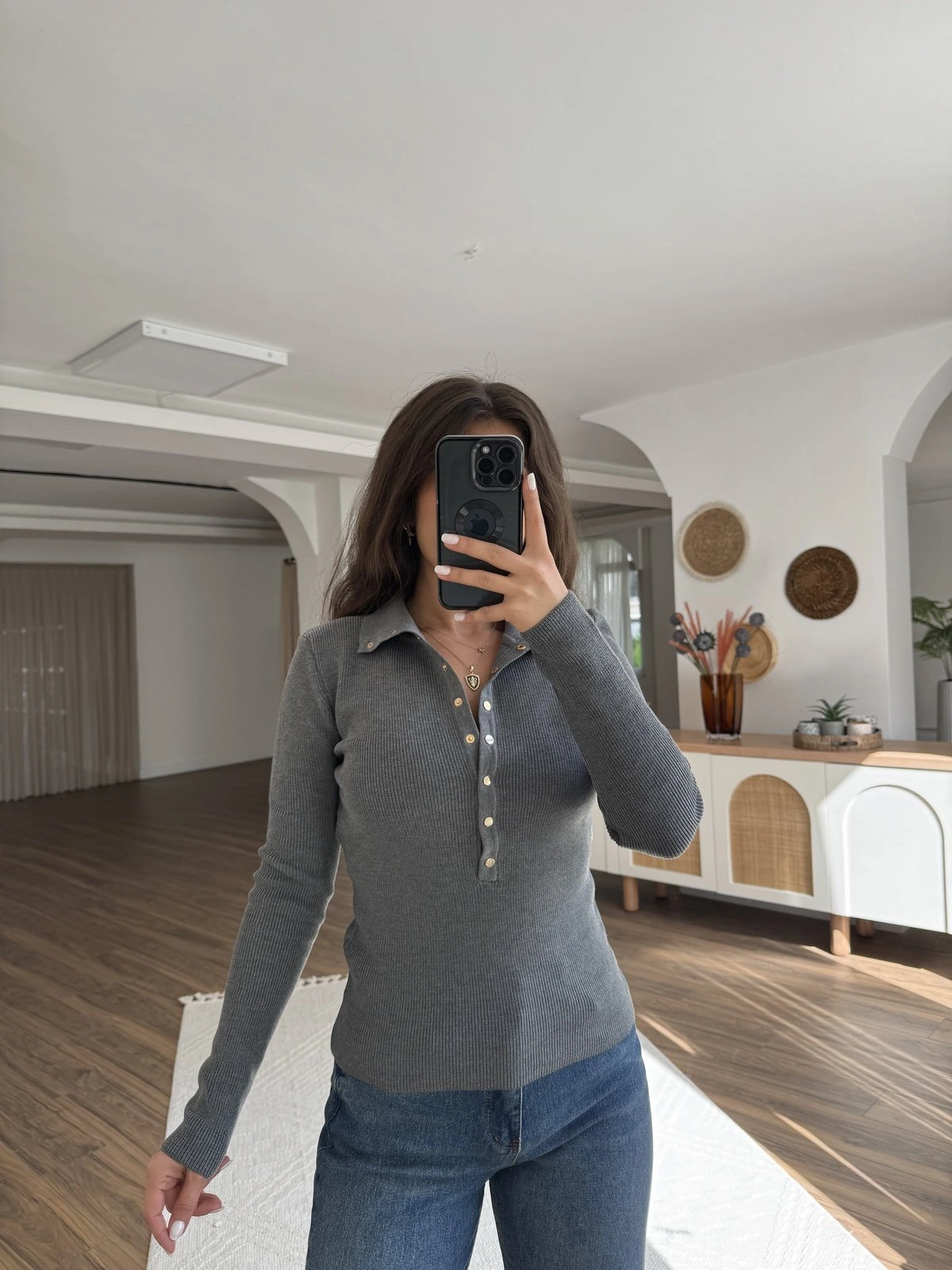 DİK YAKA ÇITÇITLI PAMUK KARIŞIM KAZAK – FÜME