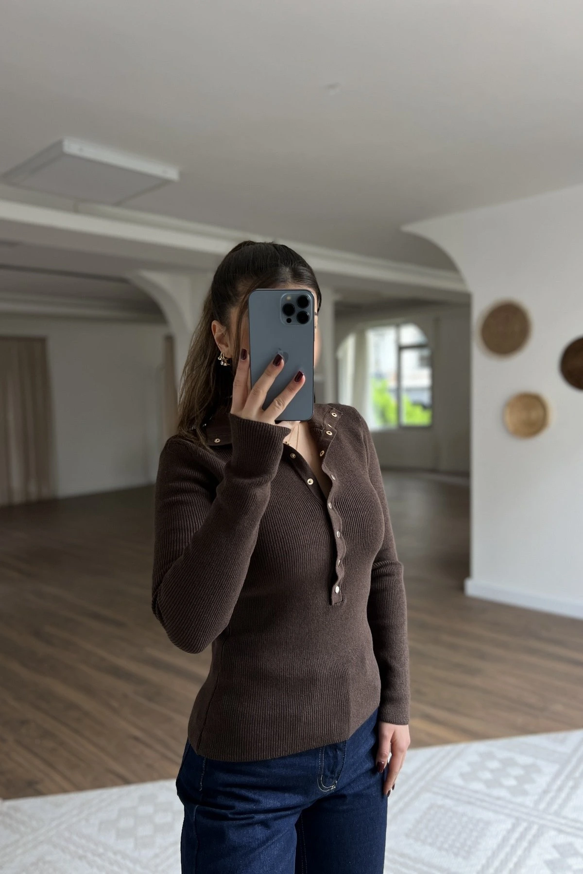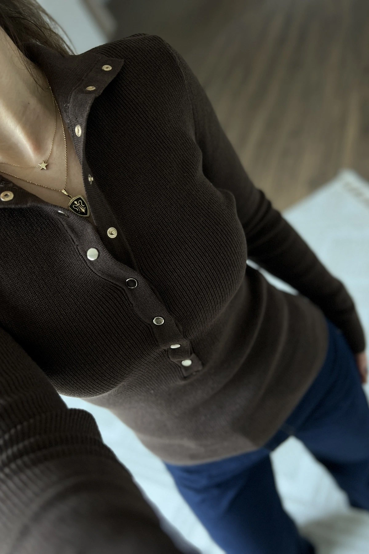DİK YAKA ÇITÇITLI PAMUK KARIŞIM KAZAK – KAHVE