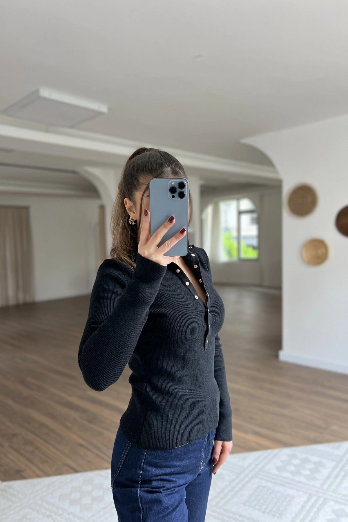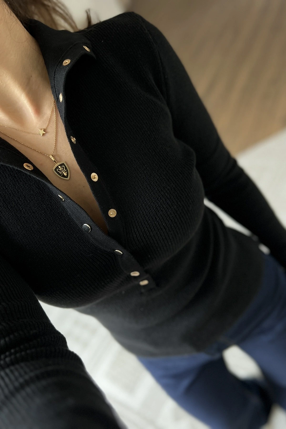 DİK YAKA ÇITÇITLI PAMUK KARIŞIM KAZAK – SİYAH