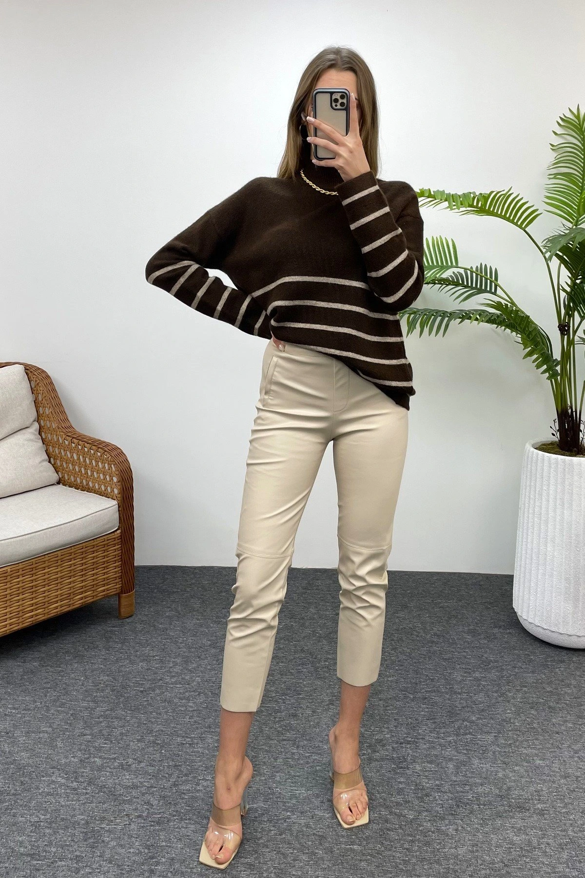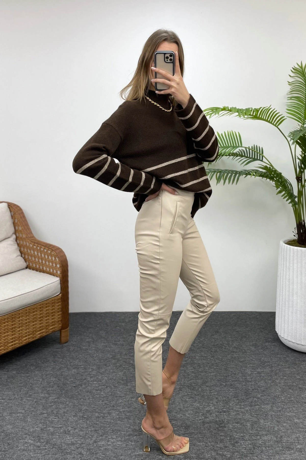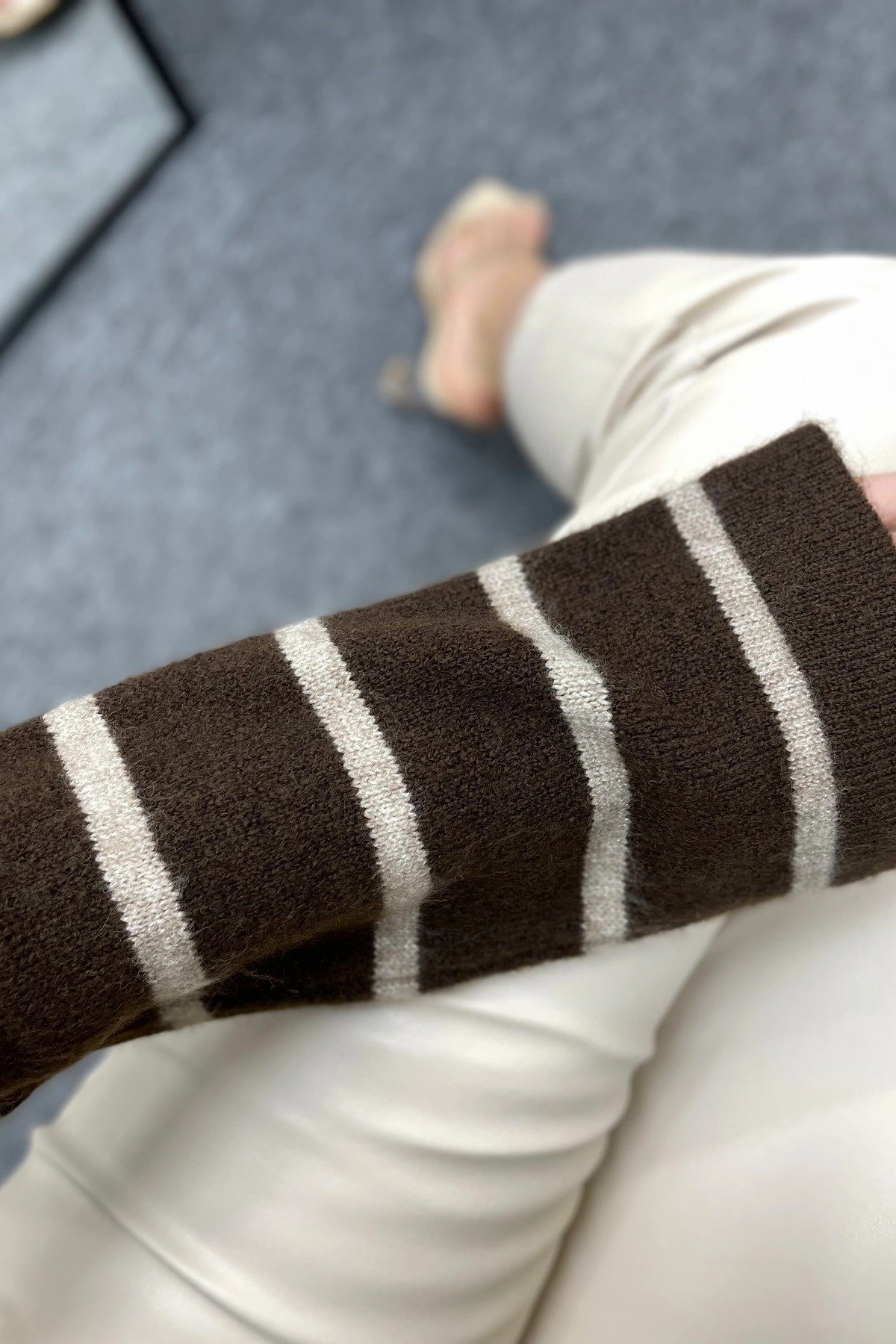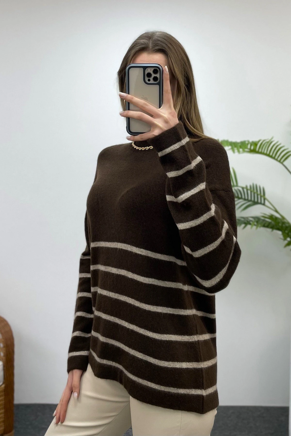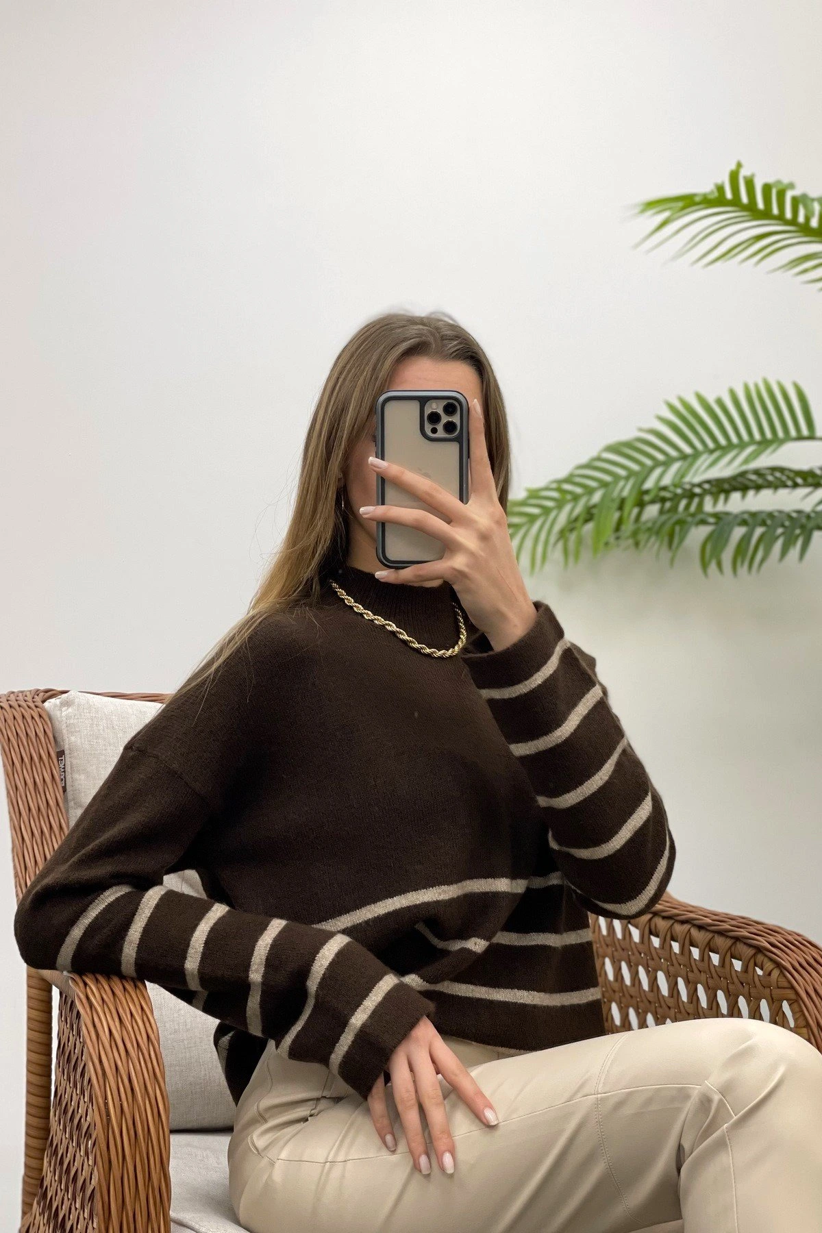 DİK YAKA ÇİZGİLİ KAZAK – KAHVE